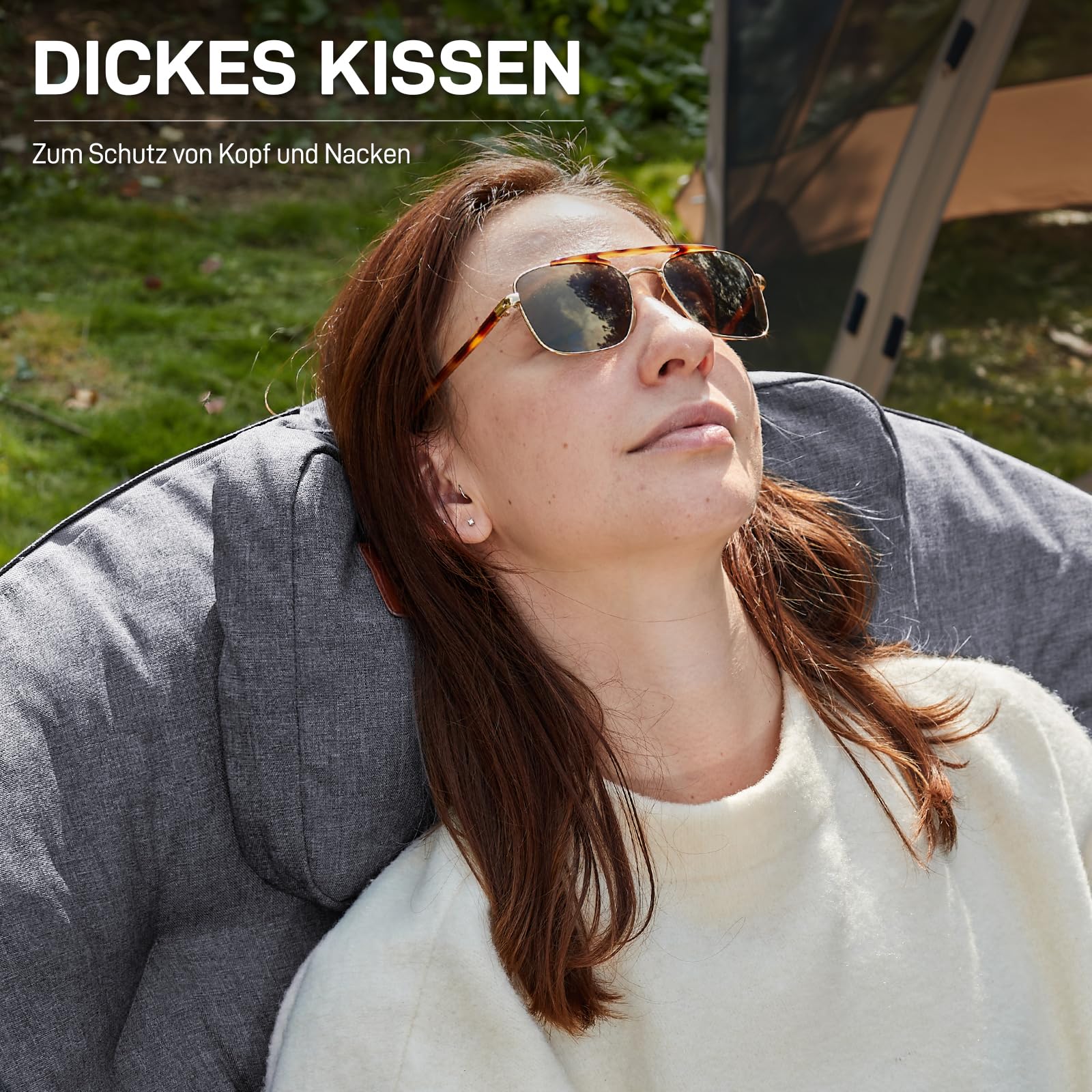 Der Stuhl bietet maximalen Komfort durch eine extra grosse, runde Sitzfläche und eine hohe Rückenlehne, die beide mit einer 6 cm dicken Polsterung versehen sind. Ein abnehmbares, weiches Kopfkissen stützt zusätzlich Nacken und Kopf für ultimative Entspannung.