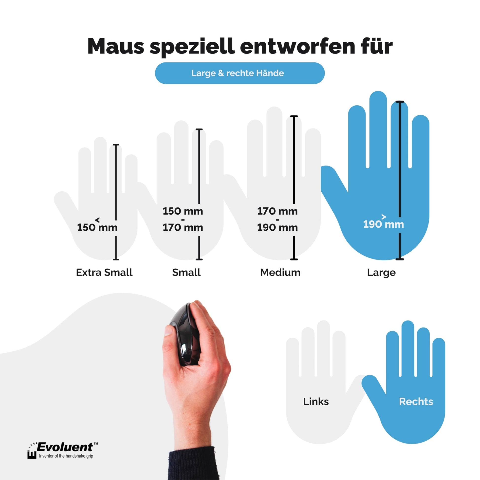 Die grosse Ausführung ist ideal für Hände mit einer Länge von über 190 mm, gemessen von der Spitze des Mittelfingers bis zur ersten Handgelenksfalte. Für kleinere Hände bietet Evoluent andere Grössen an, um optimalen Komfort und Kontrolle für jeden Nutzer zu gewährleisten.