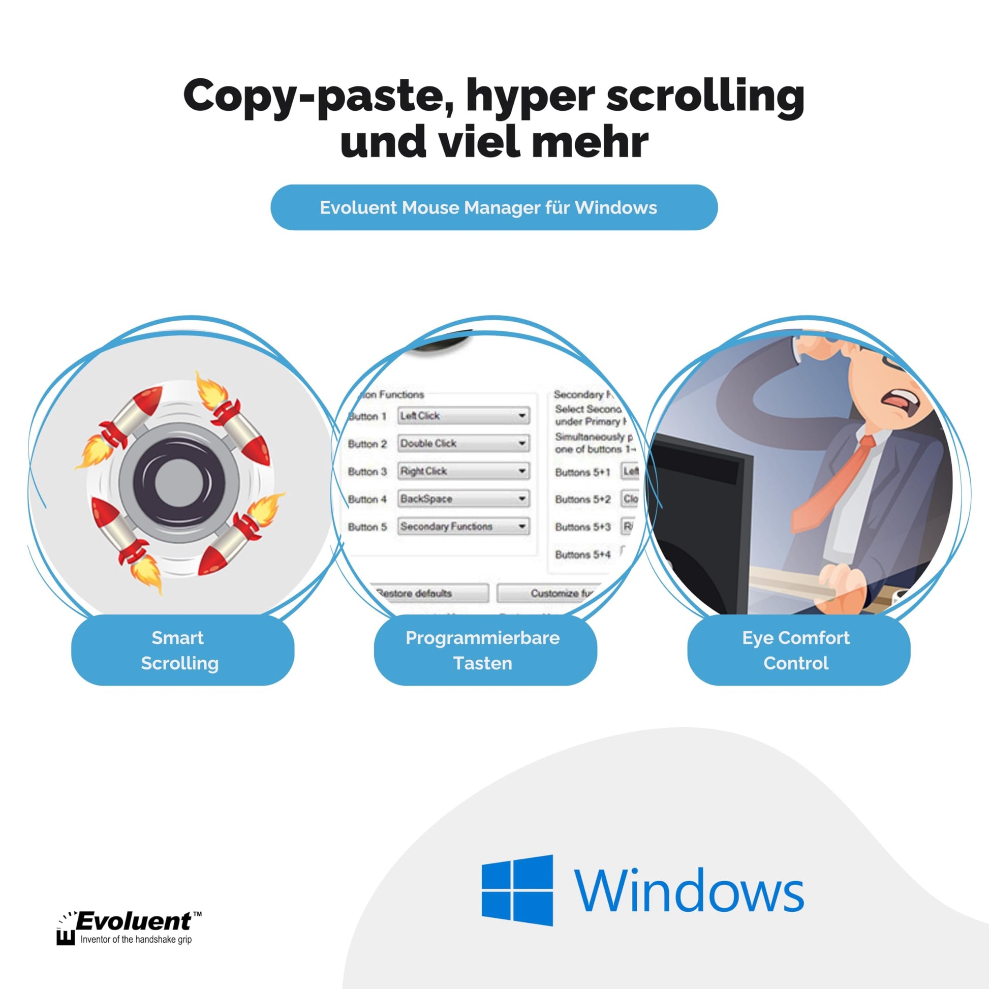 - Individuell programmierbare Tasten: Mit dem Evoluent Mouse Manager können Sie die Funktionen aller Tasten nach Ihren Wünschen konfigurieren – sogar für unterschiedliche Programme und Anwendungen.