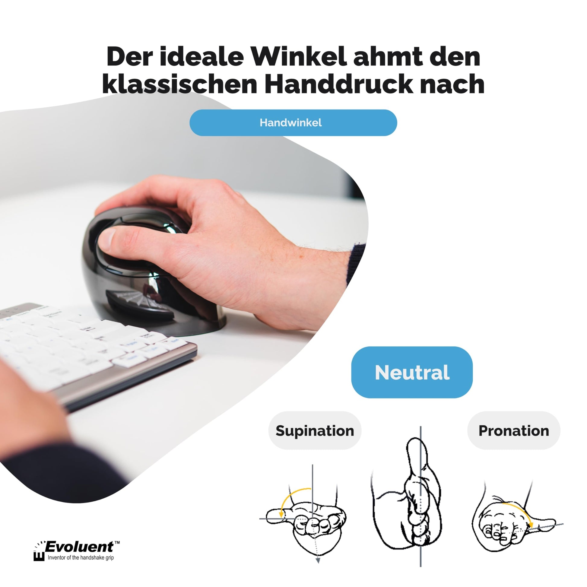 Ihre patentierte, aufrechte Form hält Ihre rechte Hand und Ihren Unterarm in einer natürlichen Haltung, ähnlich einem Händedruck. Dies verhindert das ungesunde Verdrehen des Unterarms, reduziert Muskelbelastungen und beugt so effektiv Handgelenksbeschwerden (wie z.B. RSI-Syndrom) vor, die bei herkömmlichen Mäusen auftreten können.