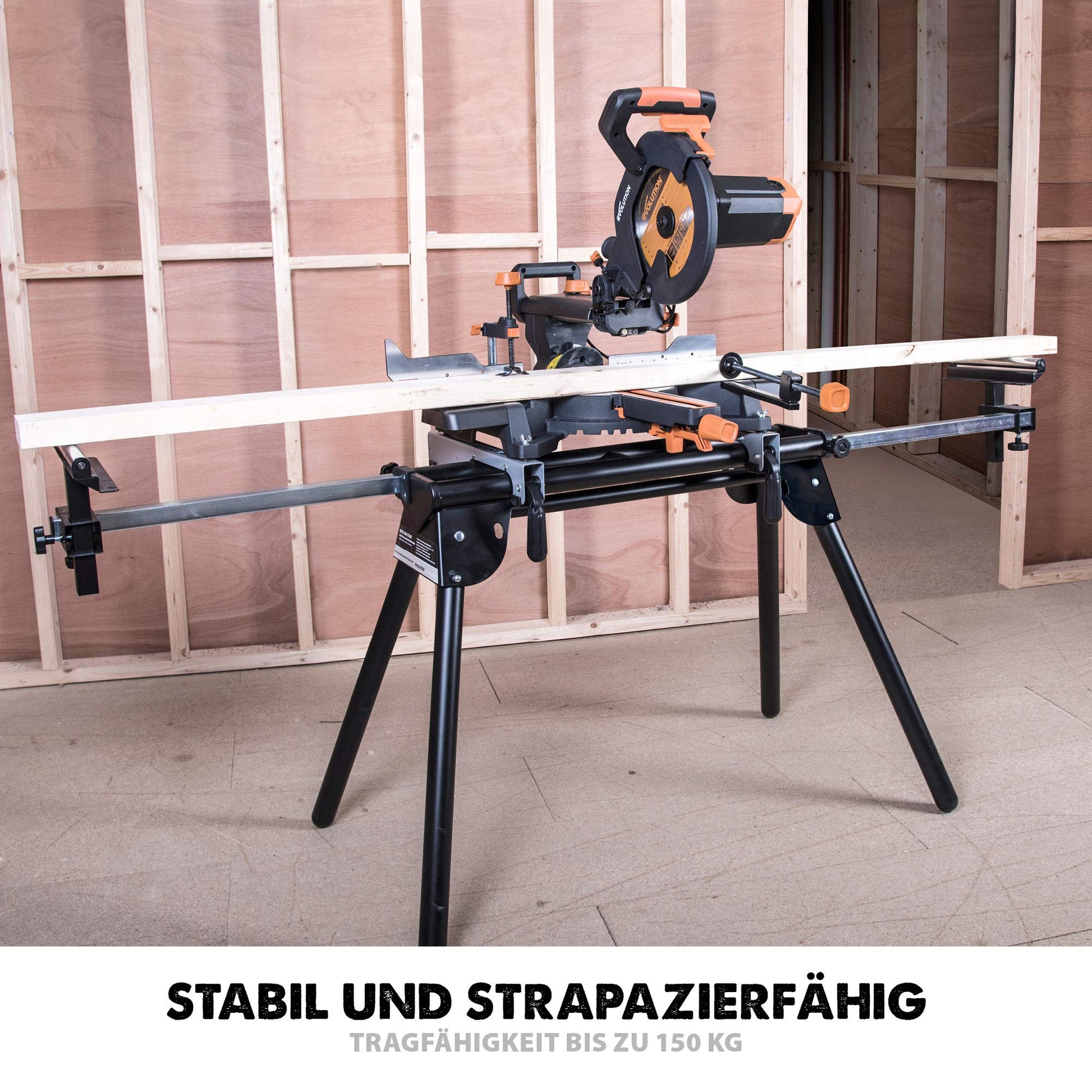 Das Untergestell hat eine maximale Tragfähigkeit von 150 kg. Die robuste Konstruktion sorgt für einen sicheren und stabilen Stand, was die Präzision und Sicherheit bei allen Sägearbeiten erhöht.