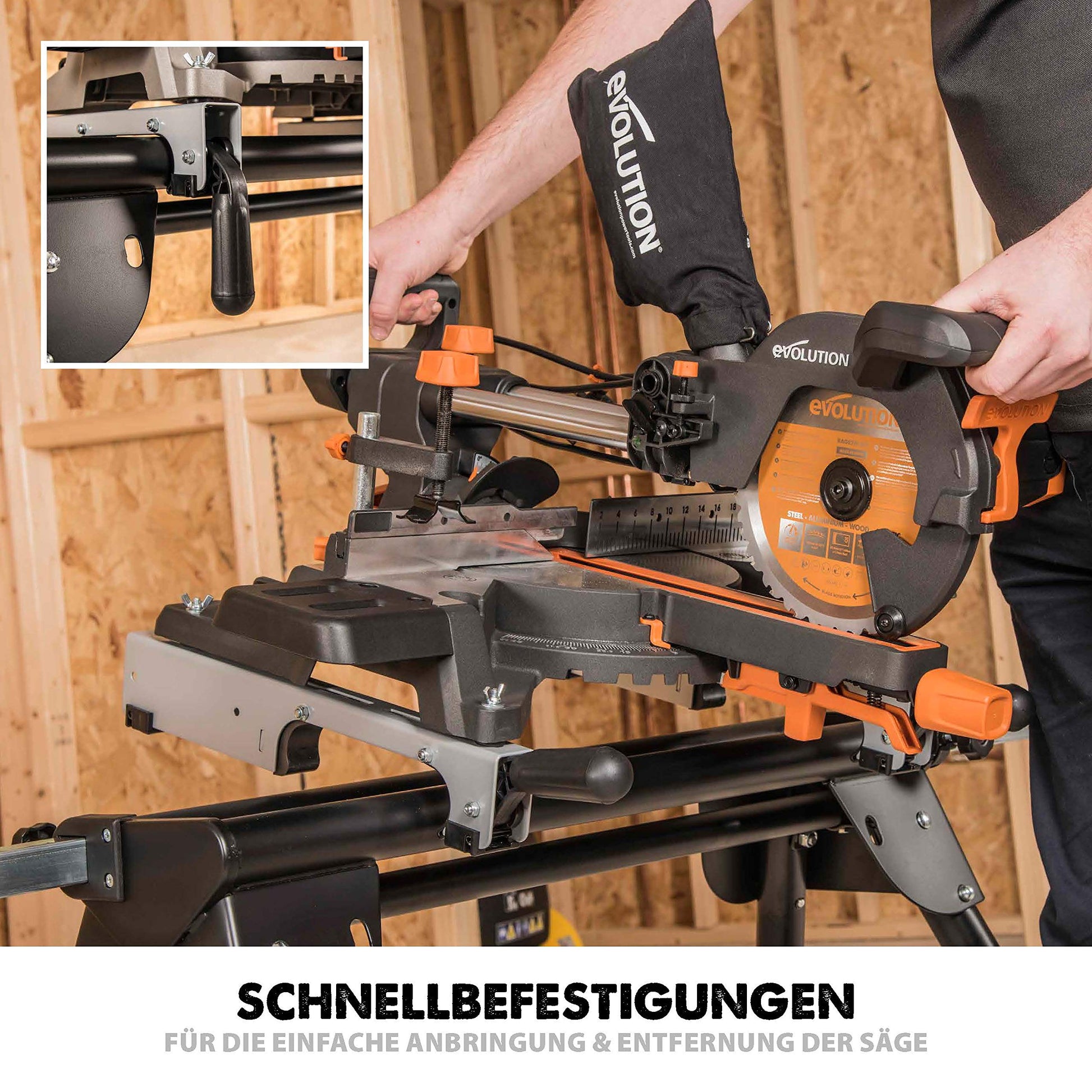 - Universelle Kompatibilität: Der Ständer ist mit Gehrungssägen von Evolution sowie den meisten anderen gängigen Marken wie Einhell, Metabo, Makita, DeWalt und Bosch kompatibel.