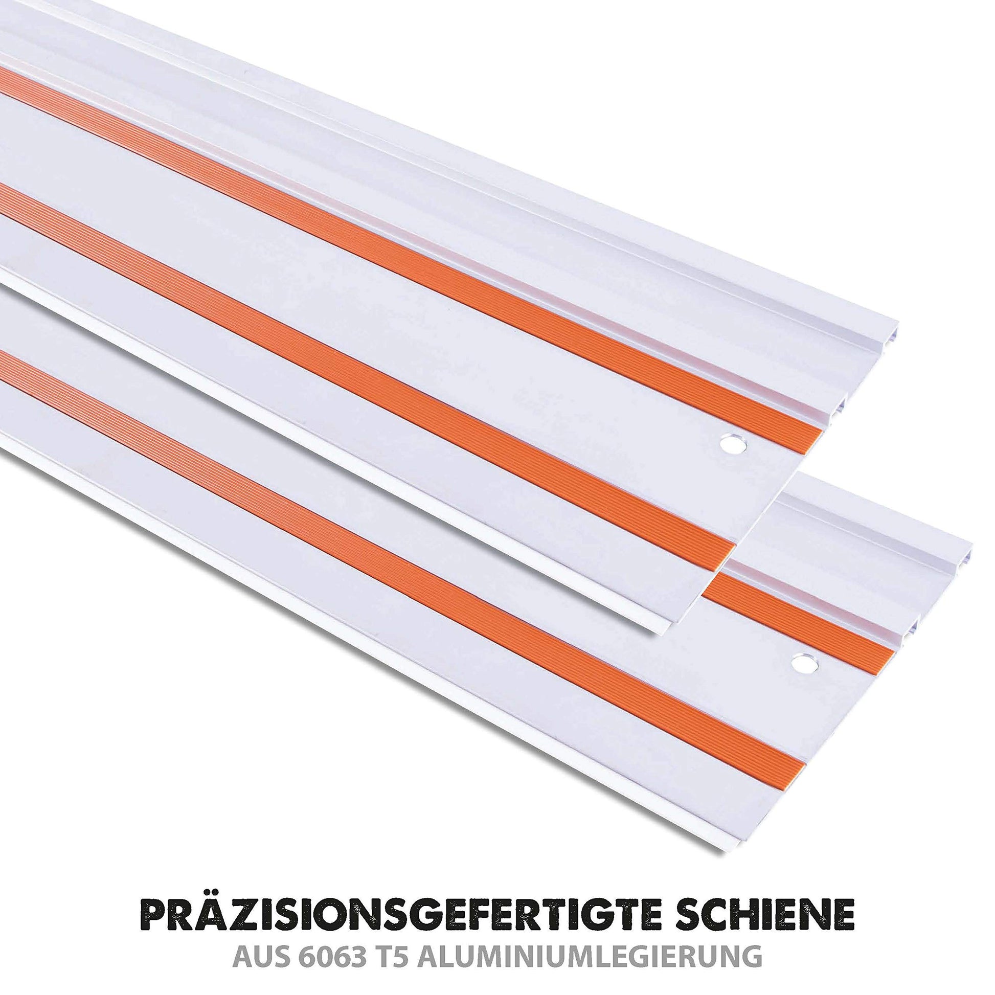 - Komplettes Zubehörset: Im Lieferumfang sind zwei Schienenteile, die passenden Verbinder, zwei Klemmen zur sicheren Fixierung am Material sowie eine robuste Tragetasche für Transport und Lagerung enthalten.