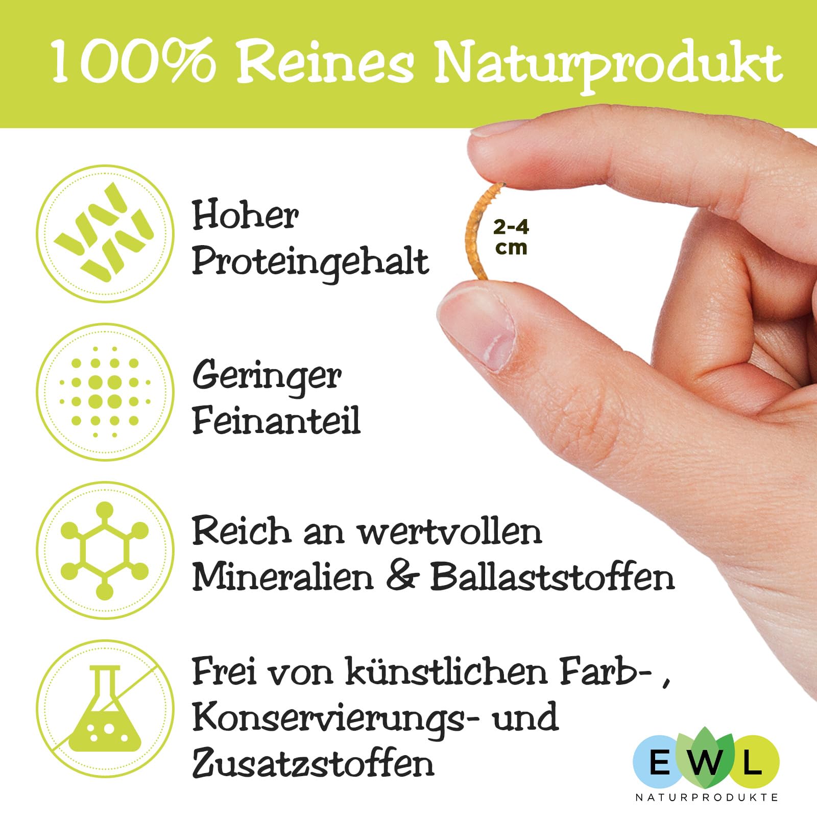 - Qualität: Dank eines sanften Trocknungsverfahrens bleiben wertvolle Nährstoffe erhalten. Die Würmer werden sorgfältig und bruchsicher verpackt.