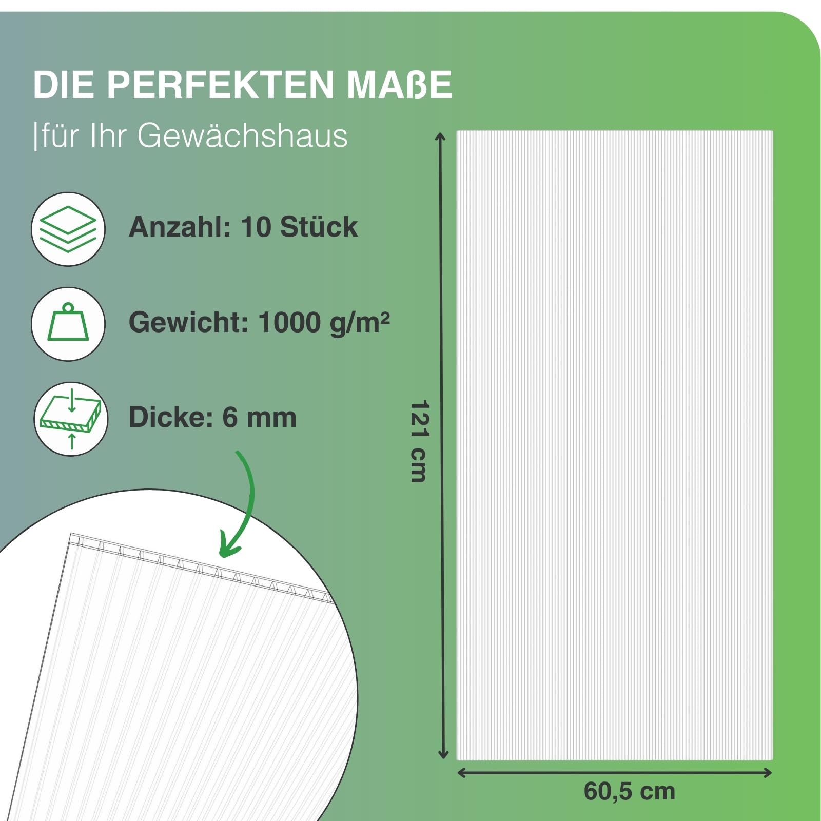 - Umfassendes Set: Das Paket enthält 10 Doppelstegplatten mit den Massen 60,5 x 121 cm, was eine grosszügige Gesamtfläche von 7,32 m² abdeckt.