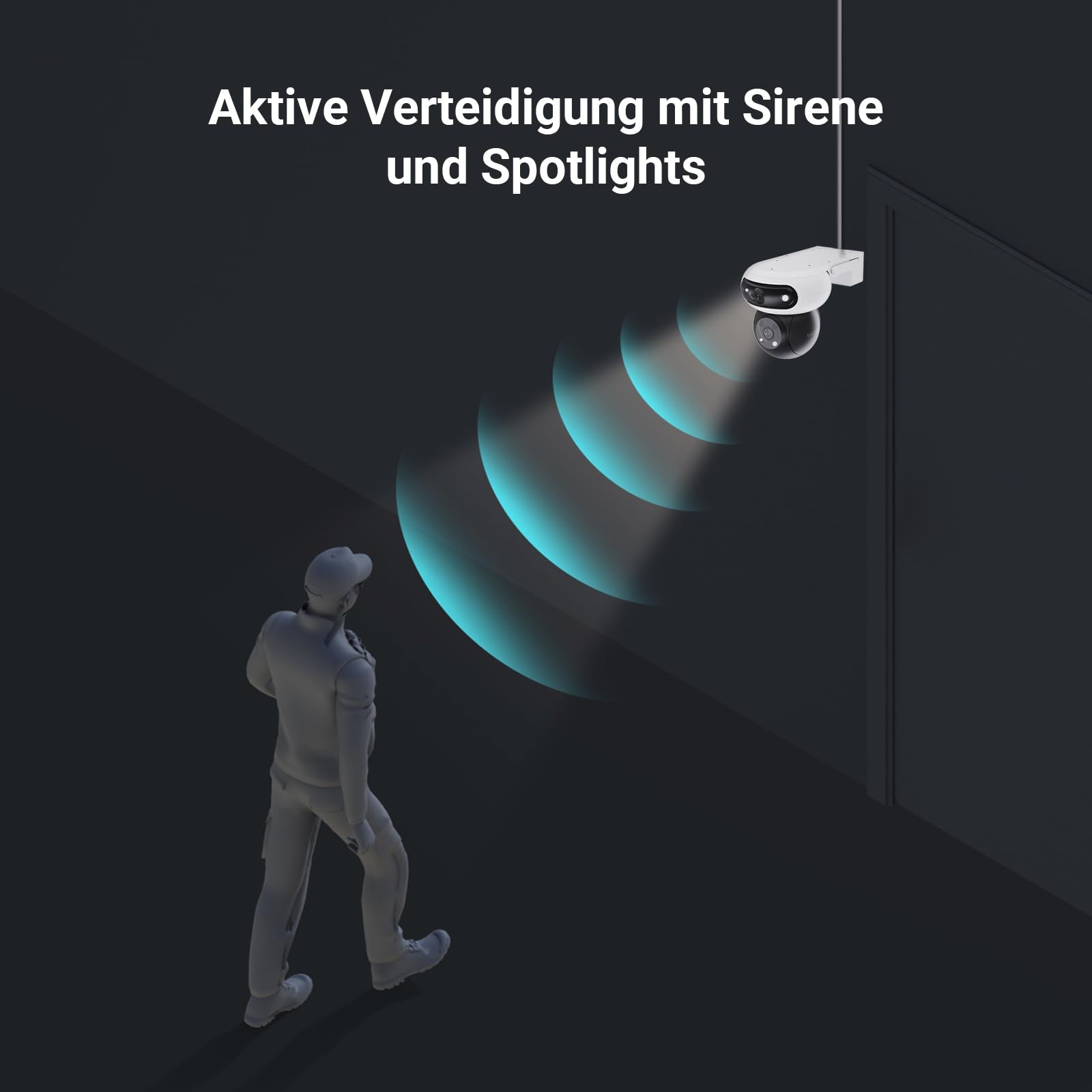 - Aktive Verteidigung: Bei der Erkennung von Eindringlingen kann die Kamera eine laute Sirene und blendende Stroboskoplichter aktivieren, um unerwünschte Besucher wirksam abzuschrecken.