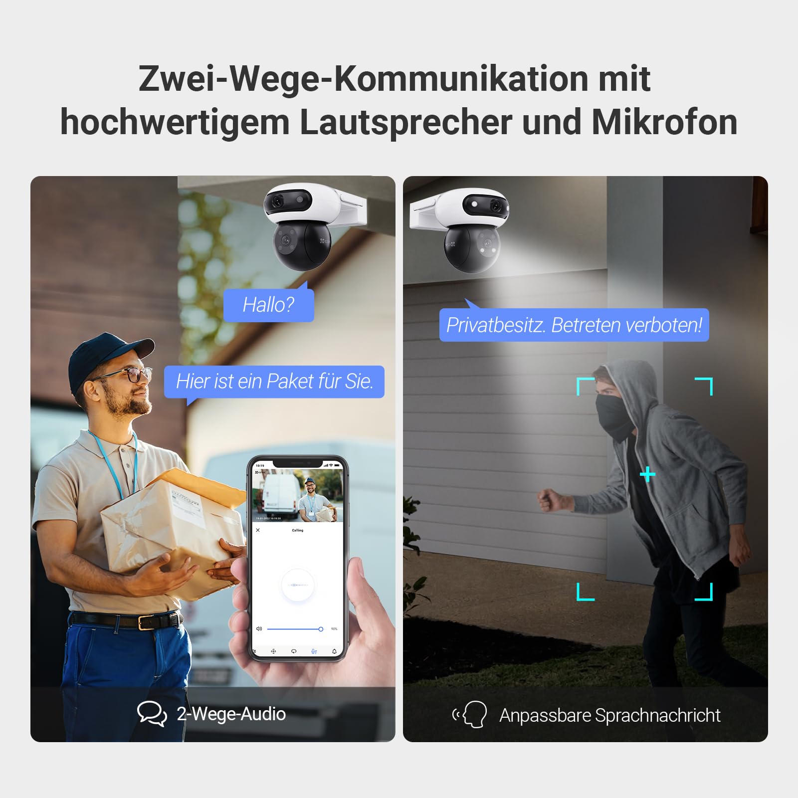 Behalten Sie jederzeit die volle Kontrolle und reagieren Sie proaktiv. Ob Sie einen Lieferanten aus der Ferne anweisen oder einen Eindringling abschrecken – die Funktionen für aktive Verteidigung und Zwei-Weg-Audio geben Ihnen die Werkzeuge an die Hand, um Ihr Eigentum wirksam zu schützen.