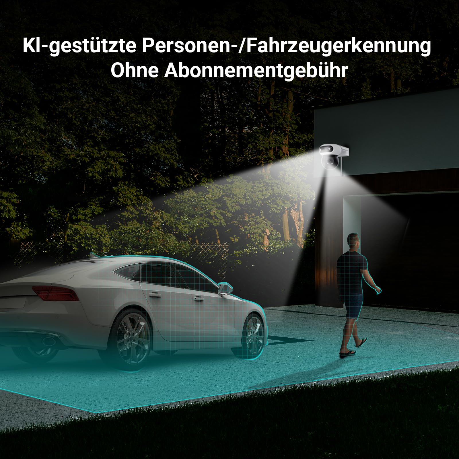 Durch einen KI-gestützten Algorithmus, der präzise zwischen Personen und Fahrzeugen unterscheiden kann. Dies reduziert Fehlalarme durch irrelevante Bewegungen erheblich und sorgt dafür, dass Sie nur bei wirklich wichtigen Ereignissen benachrichtigt werden.