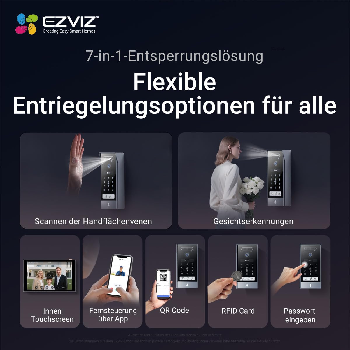 Sie haben sieben flexible Entsperrmethoden: biometrische Handflächen- und Gesichtserkennung, RFID-Karte, Passwort, temporärer QR-Code für Gäste, direkt über den 8-Zoll-Touchscreen oder bequem per EZVIZ-App von überall auf der Welt.