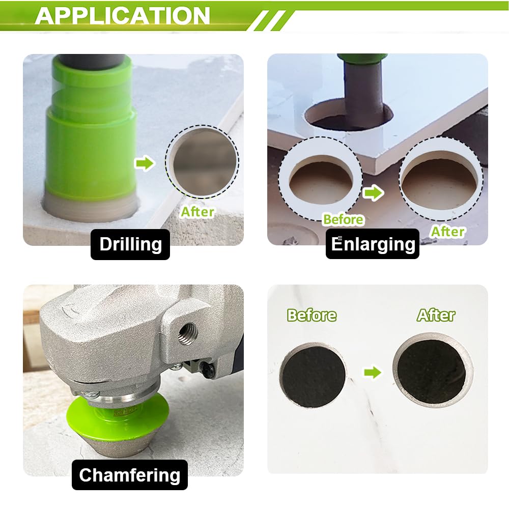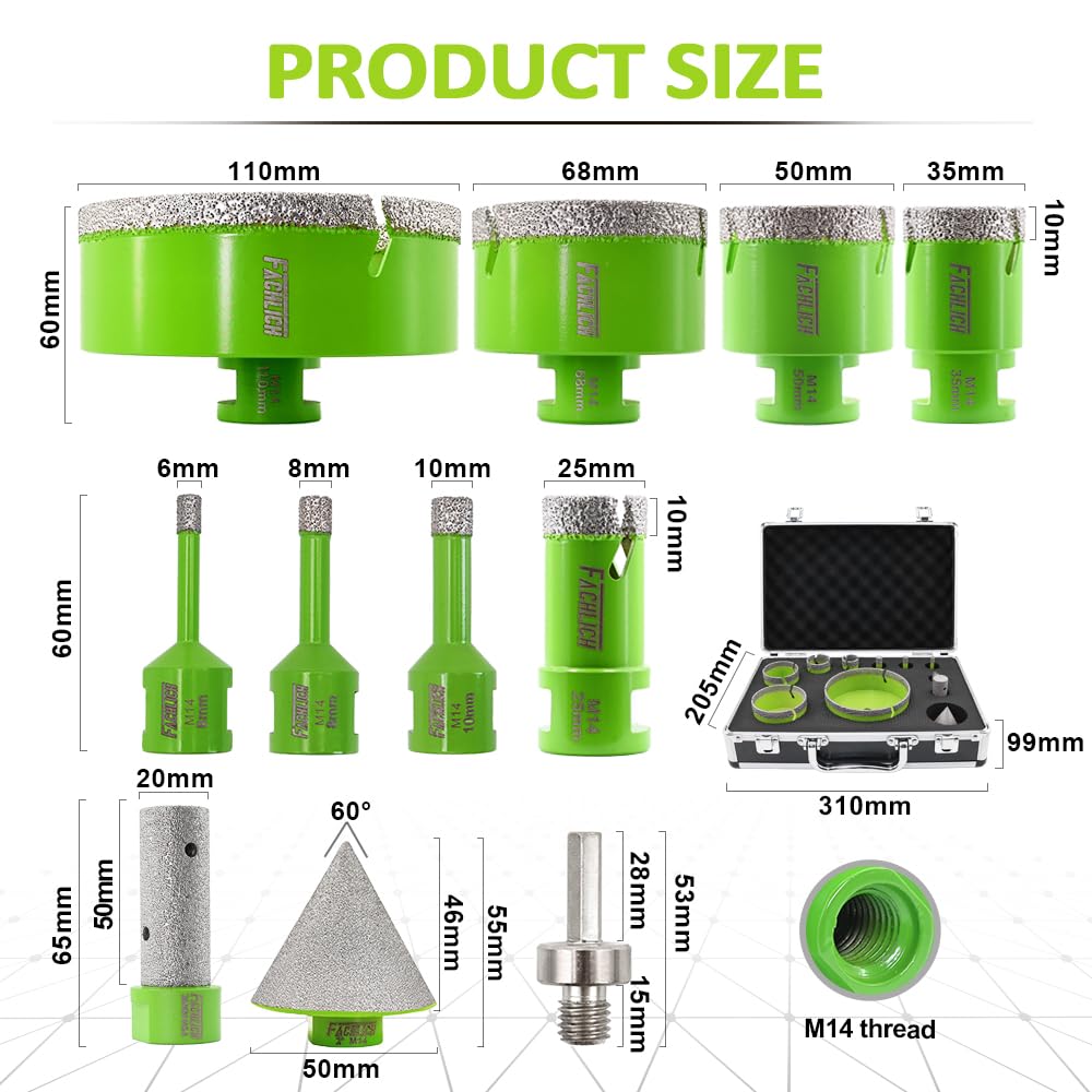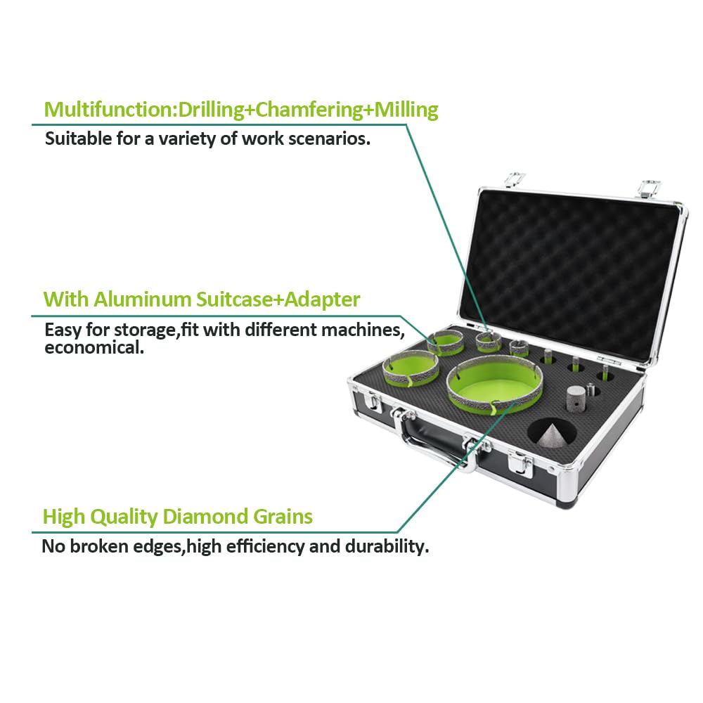 - Komplettes Set: Beinhaltet 8 Diamant-Lochsägen (6, 8, 10, 25, 35, 50, 68, 110 mm), einen 20-mm-Diamant-Fingerfräser, einen 50-mm-Diamant-Fasenfräser und einen Sechskant-Adapter (Hex-Adapter).