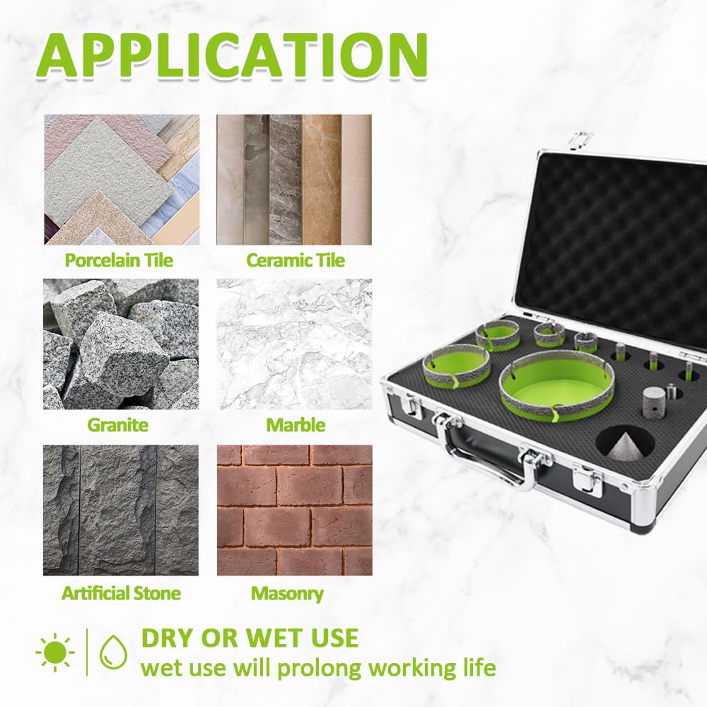 Dieses Set eignet sich ideal für das Trocken- und Nassbohren in einer Vielzahl von harten Materialien. Bearbeiten Sie mühelos Porzellan, Keramikfliesen, Granit, Marmor und weitere Steinarten. Die angemessene Zusammenstellung der Werkzeuge deckt die meisten Arbeitsanforderungen ab.
