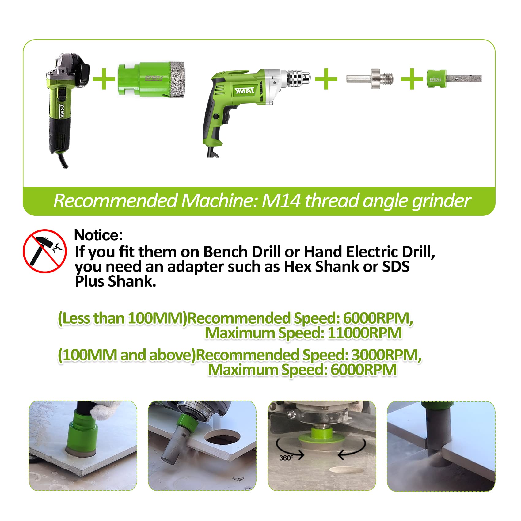 Alle Aufsätze haben ein Standard-M14-Gewinde und passen somit auf die meisten Winkelschleifer. Mit dem mitgelieferten Sechskant-Adapter können sie auch in gängigen Bohrmaschinen verwendet werden. Wichtig: Benutzen Sie bei Bohrmaschinen niemals die Schlag- oder Hammerfunktion, da dies die Diamantsegmente beschädigen kann.