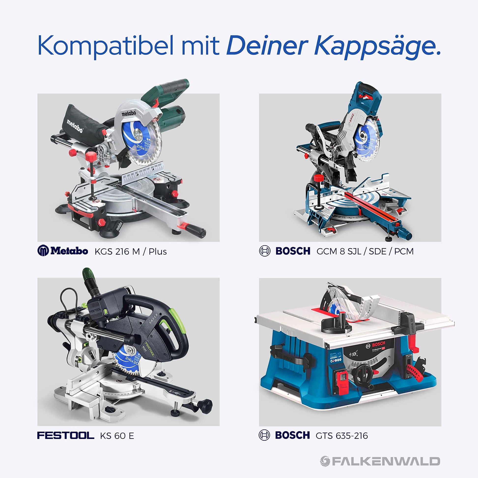 Dieses Sägeblatt mit den Massen 216 x 30 mm ist für eine breite Palette von Kappsägen und Tischkreissägen konzipiert. Es ist unter anderem kompatibel mit folgenden Modellen: