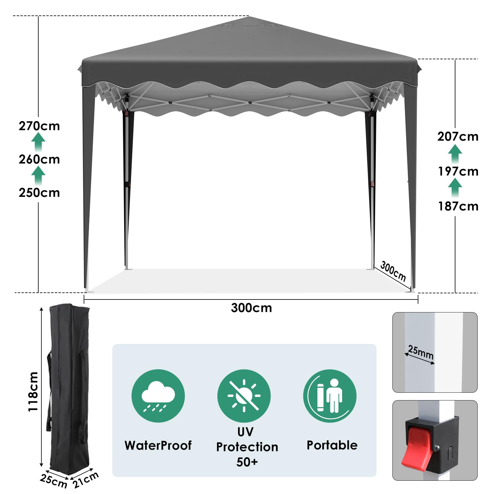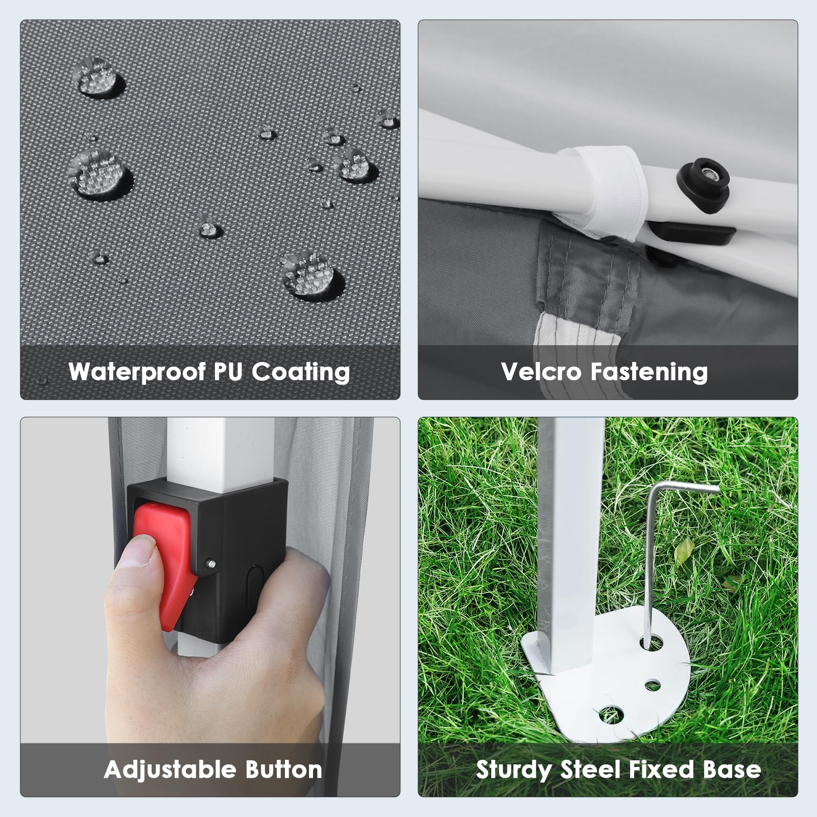 Mit einer Grundfläche von 9 Quadratmetern bietet der Pavillon bequem Platz für 6 bis 8 Personen. Er eignet sich perfekt für Familientreffen im Garten, gemütliches Grillieren, Camping-Ausflüge, Festivals oder als schattiger Stand an Sportveranstaltungen. Bitte seien Sie bei der Höhenverstellung vorsichtig, um ein Einklemmen der Finger zu vermeiden. Bei extremen Wetterbedingungen wie starkem Wind oder Schneefall empfehlen wir, den Pavillon abzubauen und an einem geschützten Ort aufzubewahren.