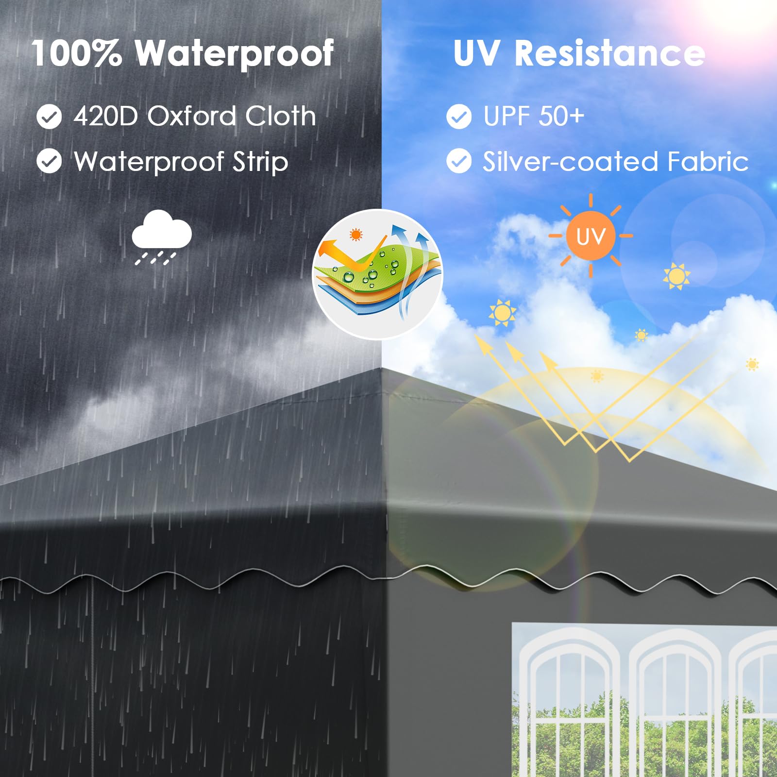 - Hochwertiges Material: Dachplane aus dichtem 420D Oxford-Gewebe mit versilberter PU-Beschichtung für 100% Wasserdichtigkeit und zertifizierten UV-Schutz 50+.