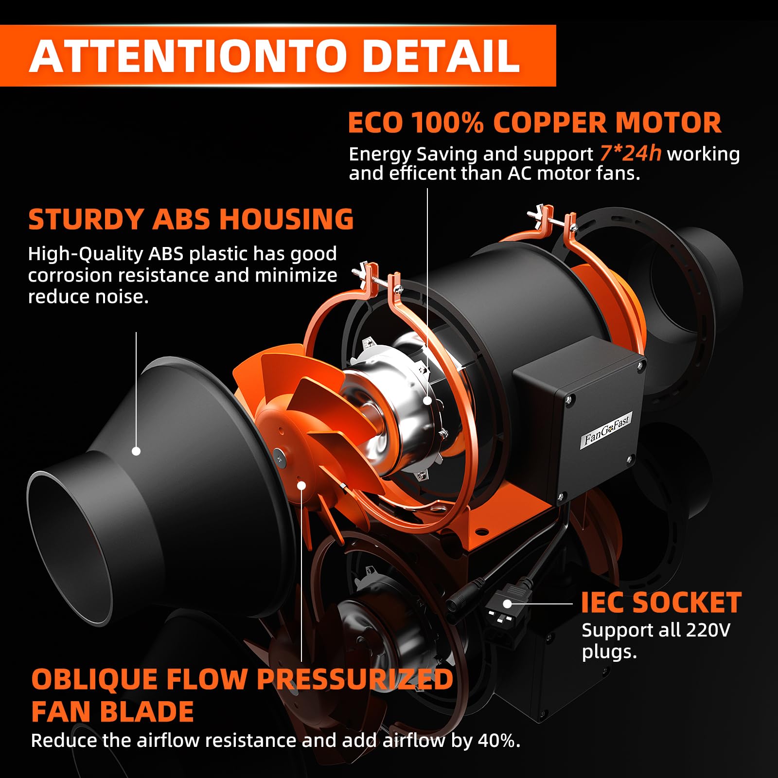 Die Installation ist sehr einfach. Das modulare Design mit abnehmbaren Rohrenden erleichtert die Montage und Wartung. Dank der praktischen IEC-Steckdose und des mitgelieferten Netzkabels mit EU-Stecker können Sie den Ventilator direkt an jede gängige 230-V-Steckdose anschliessen.