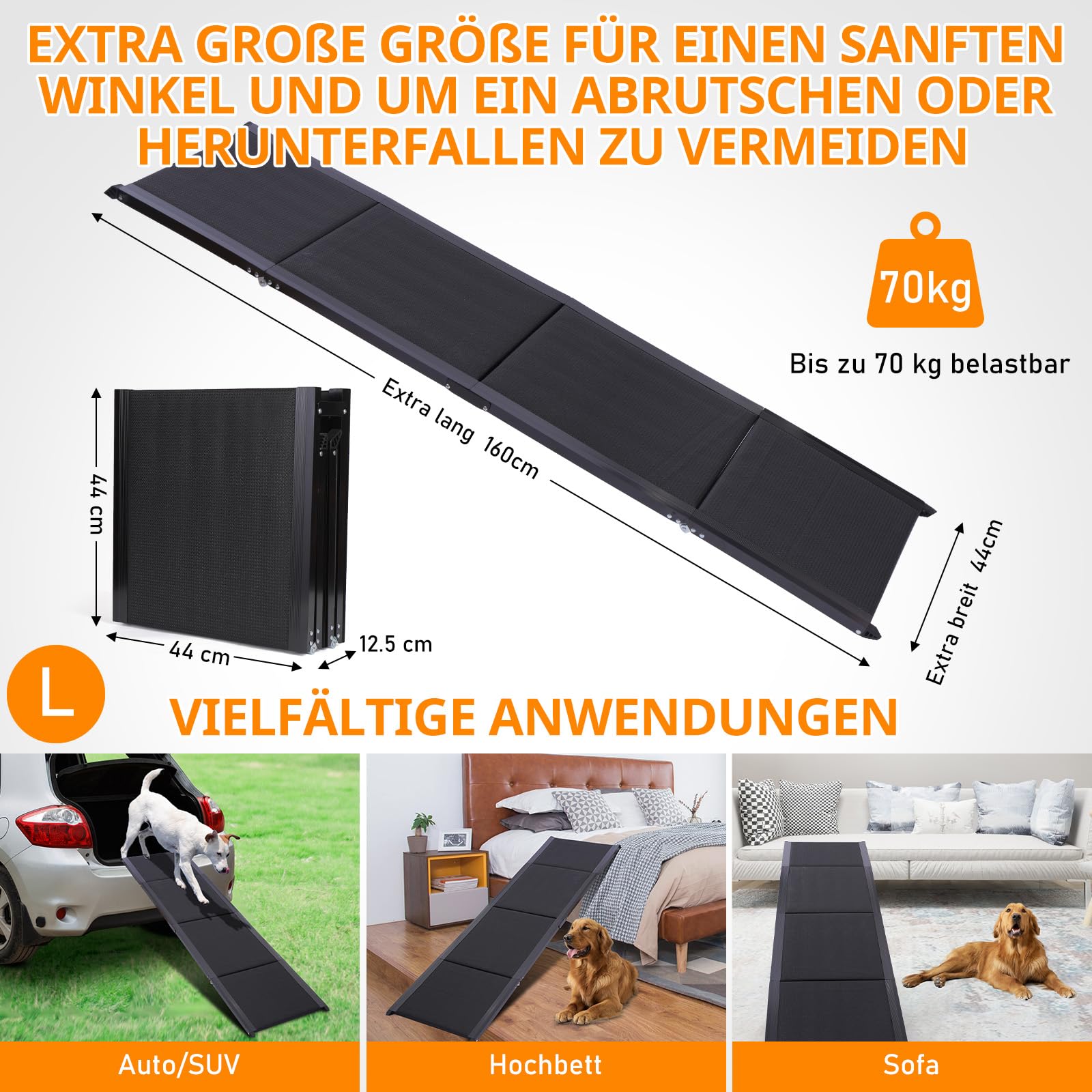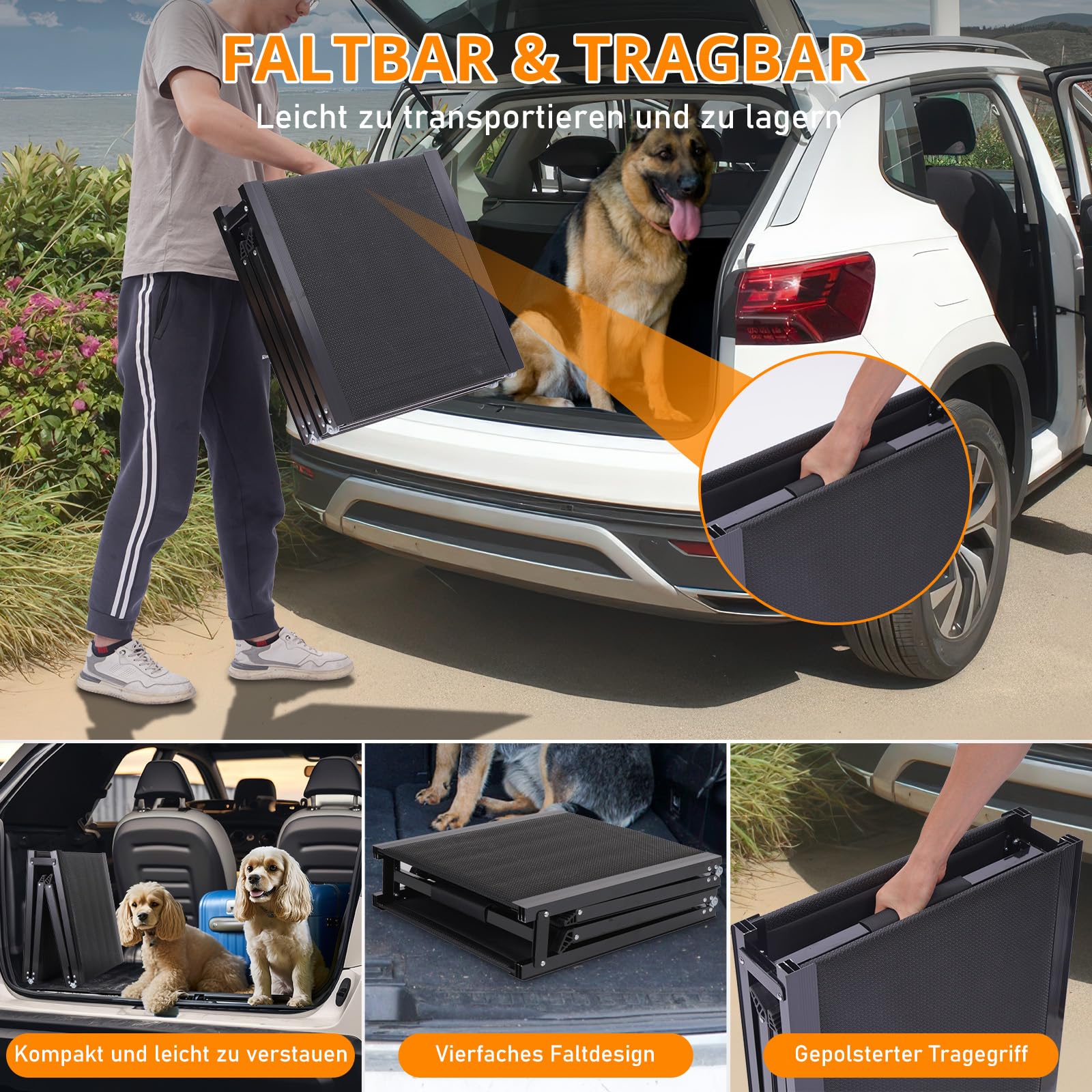 Diese Hunderampe ist universell einsetzbar und eignet sich hervorragend für Hunde aller Grössen. Sie ist die perfekte Lösung für den einfachen Zugang zu SUVs, Lieferwagen, hohen Betten oder Terrassen. Die stabile Struktur gewährleistet einen sicheren Transport für Ihren Liebling.