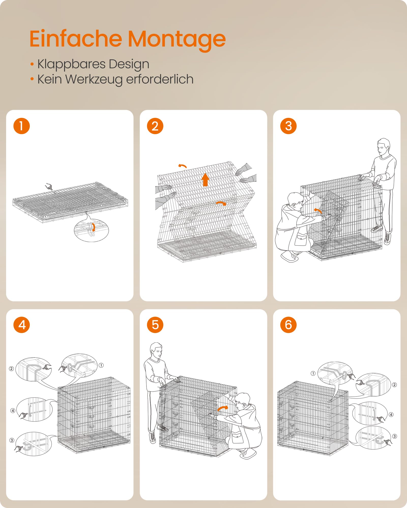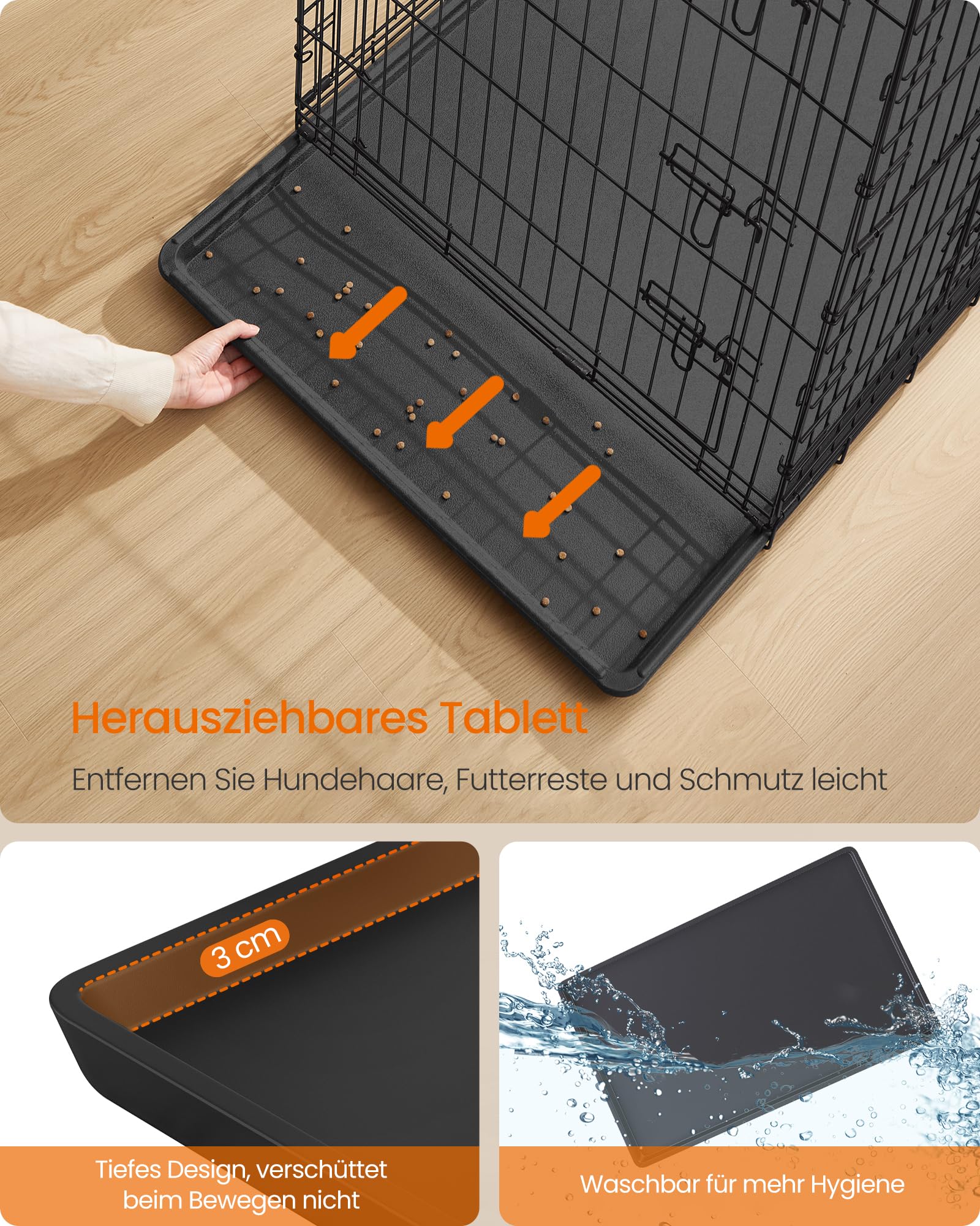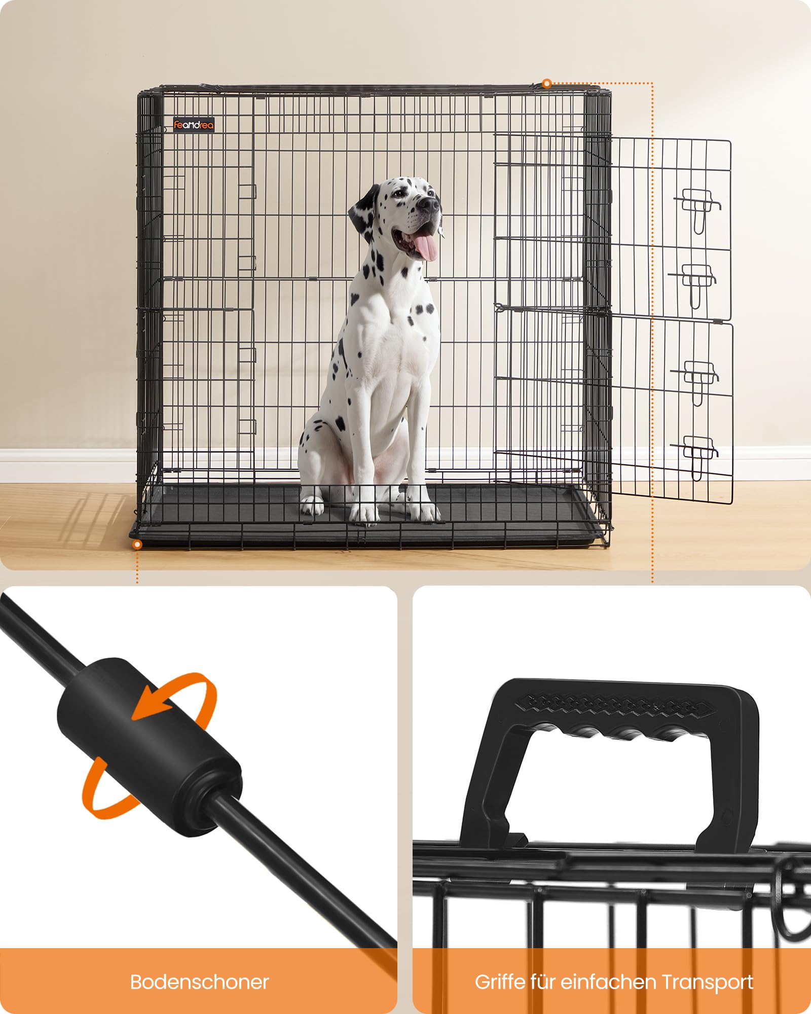 Der Käfig bietet höchste Sicherheit. Er ist aus widerstandsfähigem Metalldraht mit einer glatten, kantenfreien Oberfläche gefertigt. Jede der zwei Türen ist mit doppelten L-förmigen Sicherheitsriegeln ausgestattet, die ein ungewolltes Öffnen durch Ihren Hund effektiv verhindern.
