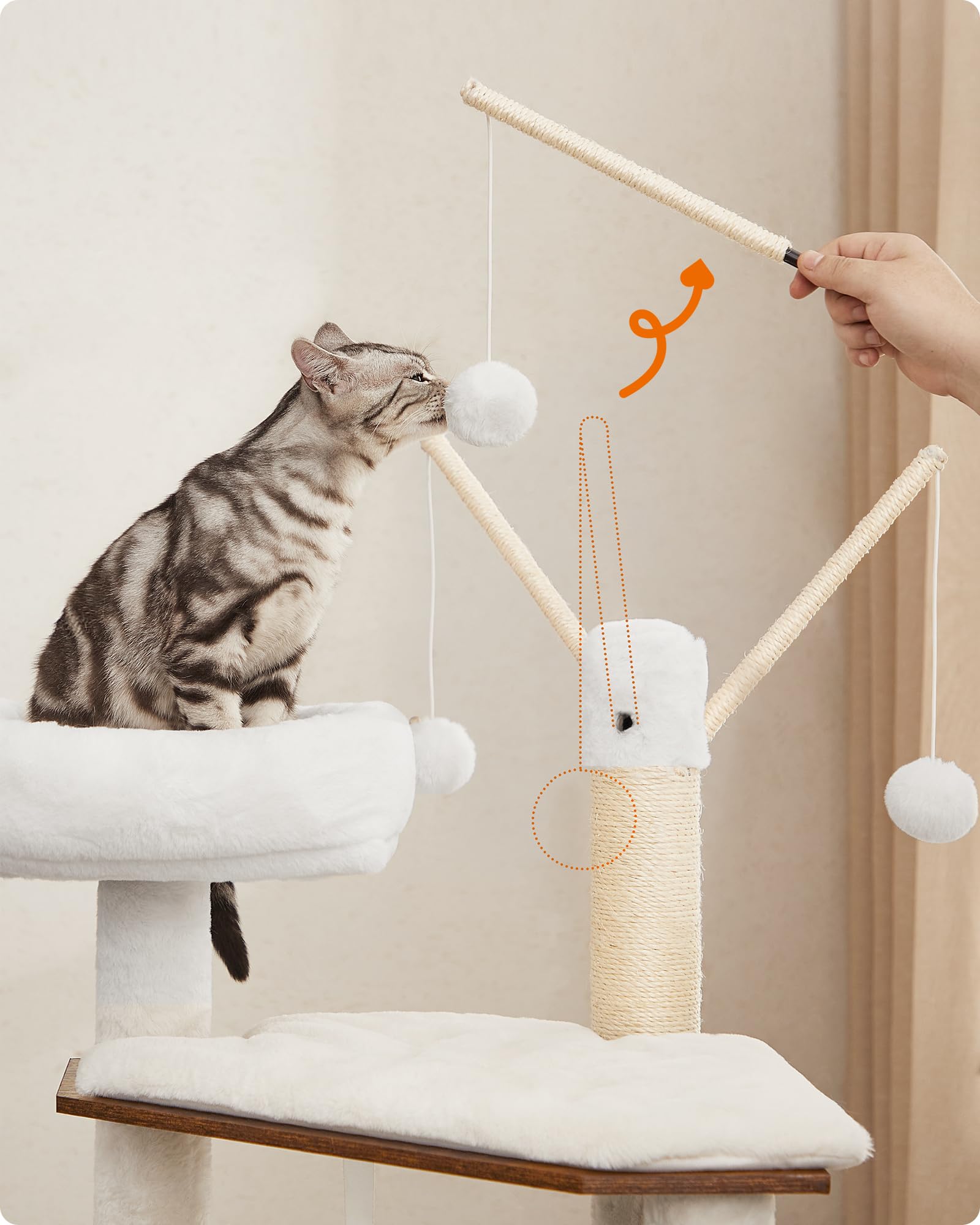Ihre Katze findet hier ein komplettes Aktivitätszentrum: Robuste Sisalstämme zur Krallenpflege, drei abnehmbare Spielbälle, eine gemütliche Höhle, eine flauschige Liegemulde zum Entspannen und eine hochgelegene, gut gepolsterte Aussichtsplattform zur Beobachtung.