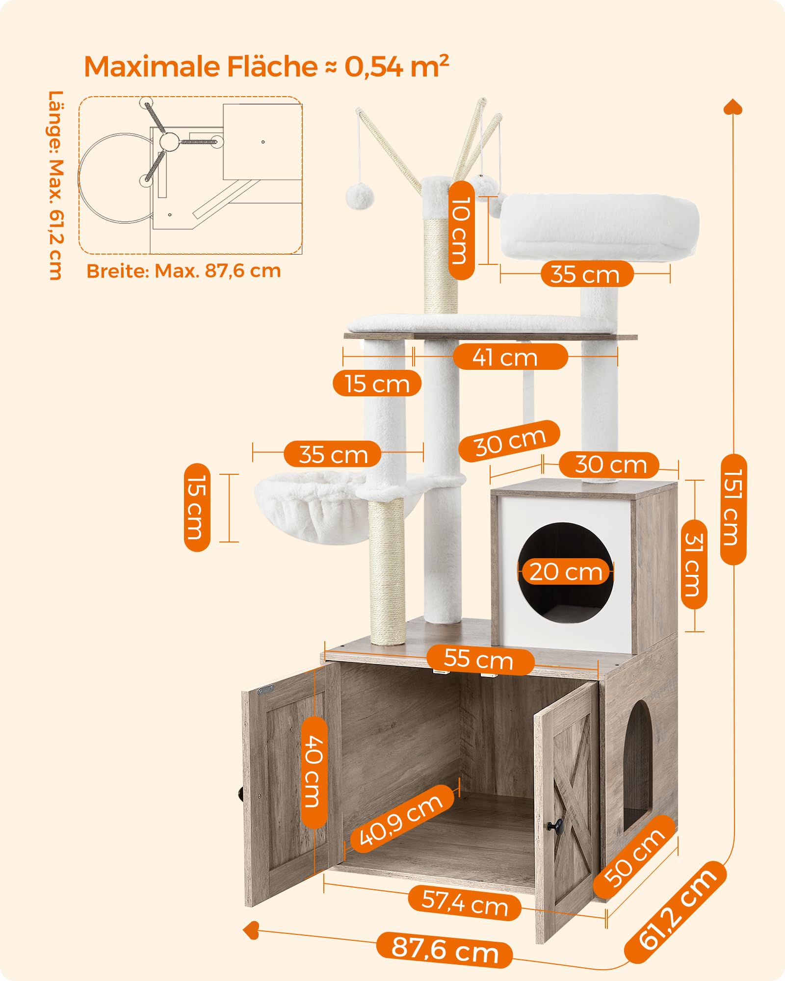 - 2-in-1-Design: Eine intelligente Kombination aus Kratzbaum und Katzenklo-Schrank auf einer kompakten Grundfläche von nur 57,5 x 50 cm – ideal für platzbewusstes Wohnen.
