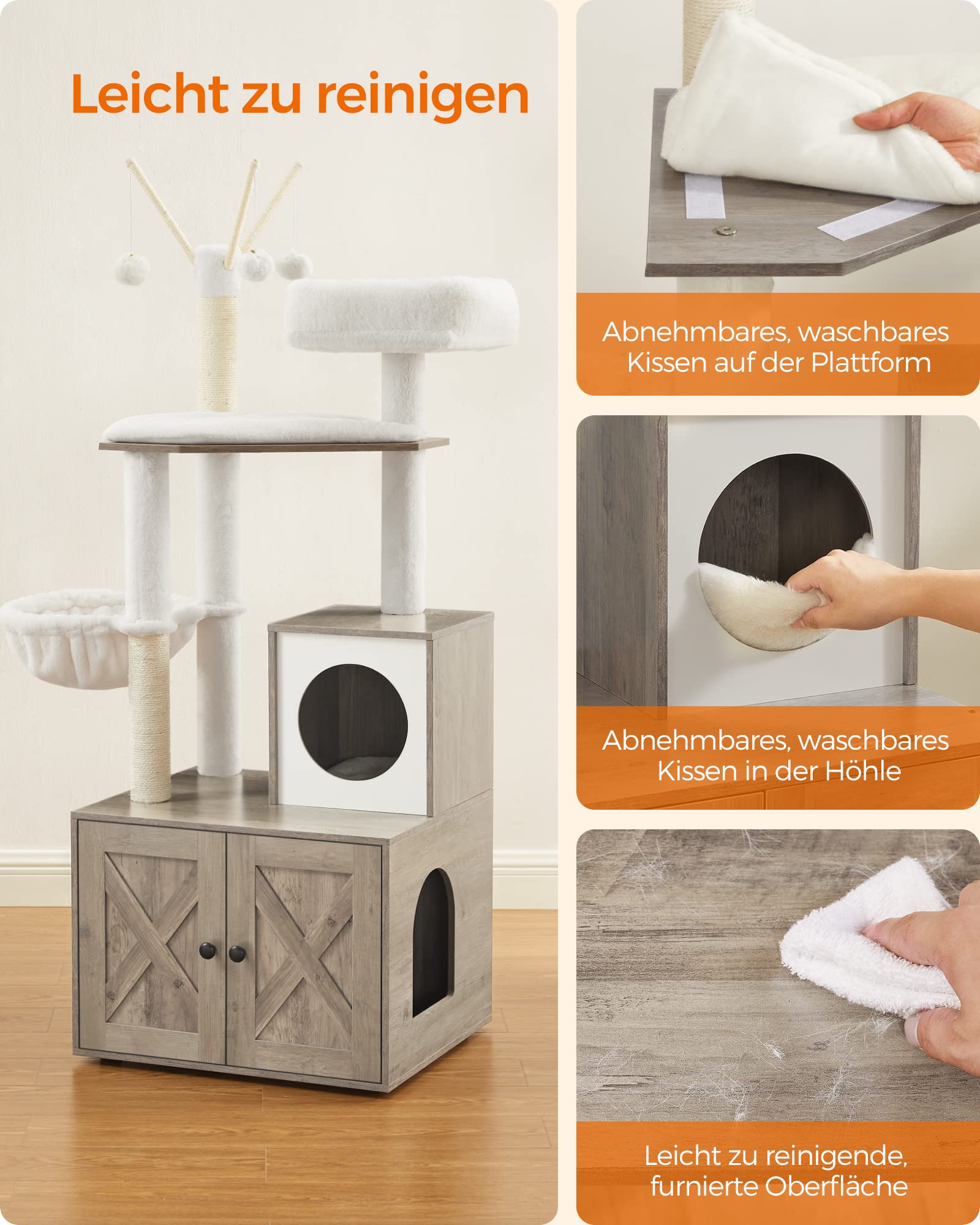 Dank der widerstandsfähigen Materialien und der pflegeleichten, waschbaren Elemente ist dieses Katzenmöbel eine langfristige Investition. Die Reinigung gestaltet sich unkompliziert, was für Sie weniger Aufwand und für Ihren Stubentiger eine konstant saubere Wohlfühloase bedeutet.