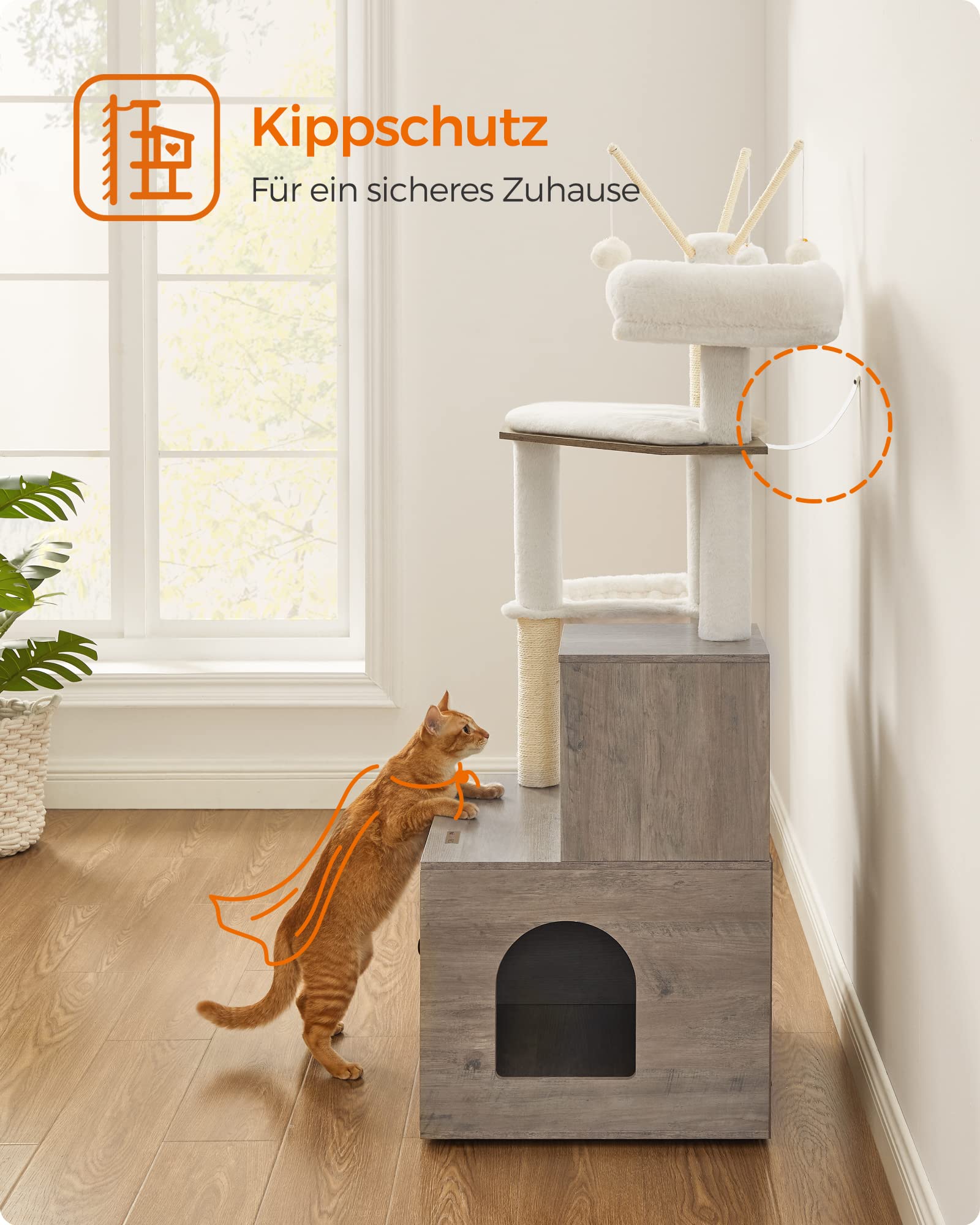 Anstatt eines separaten Kratzbaums und einer freistehenden Katzentoilette erhalten Sie ein einziges, stilvolles Möbelstück. Das spart wertvollen Platz in Ihrer Wohnung und bietet Ihrer Katze einen zentralen Ort für all ihre Bedürfnisse – vom Spielen und Schlafen bis hin zum Verrichten der Notdurft.