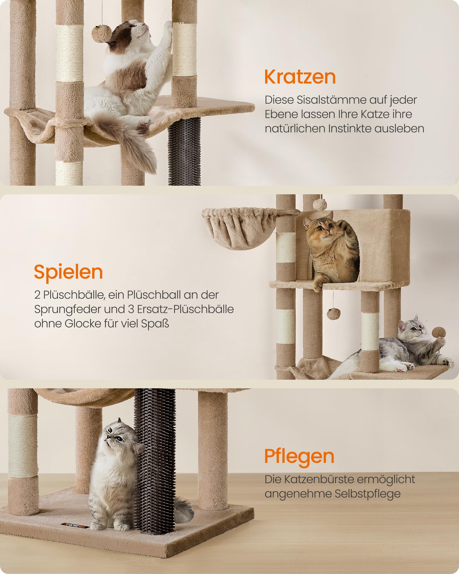 - Krallenpflege: Fünf robuste, mit Sisal umwickelte Kratzsäulen auf verschiedenen Ebenen unterstützen die natürliche Krallenpflege.