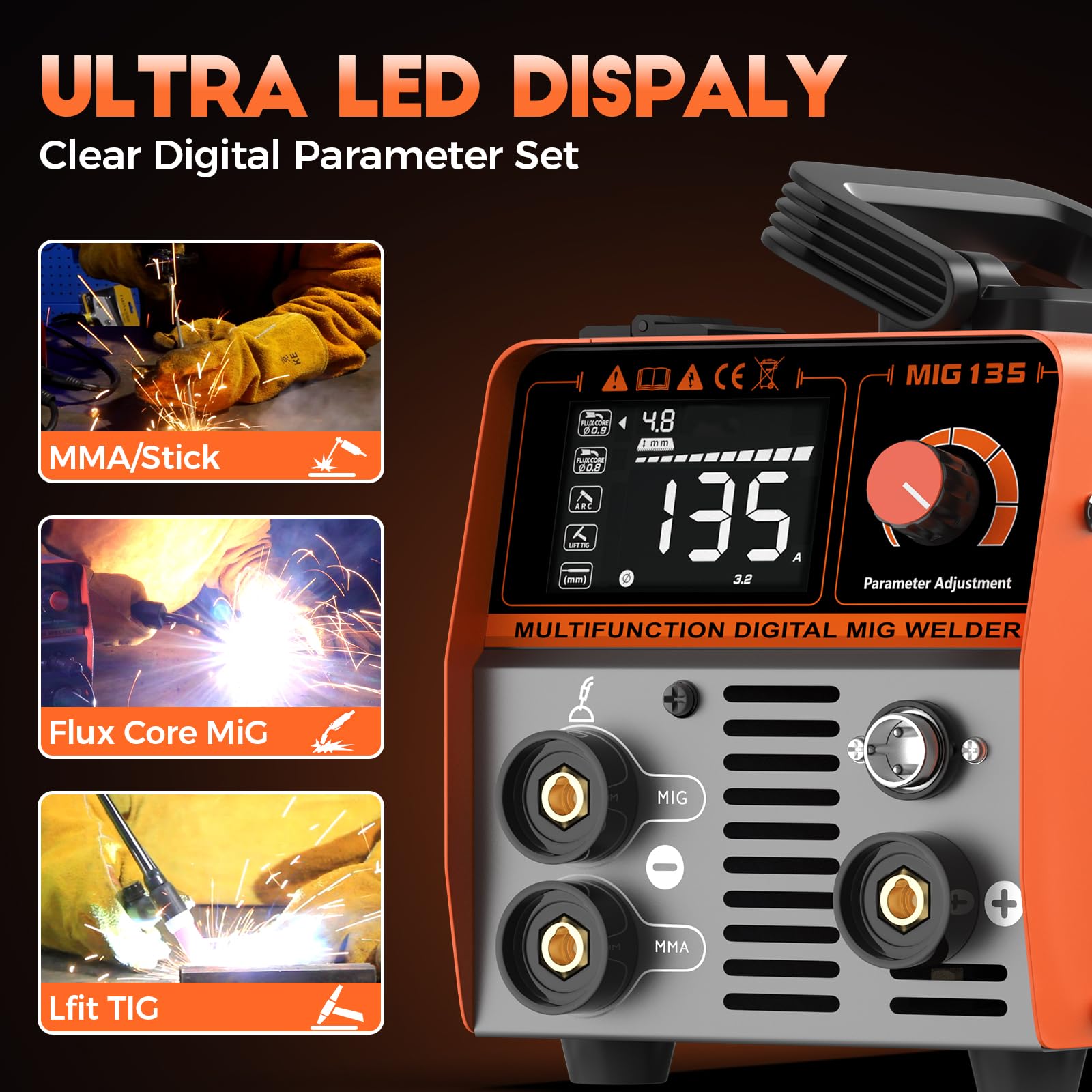 Das Schweissgerät ist ideal für die Bearbeitung von Kohlenstoffstahl und Edelstahl. Mit einer Leistung von bis zu 135 Ampere können Sie Materialien mit einer Dicke von ca. 1,5 mm bis 4 mm effektiv schweissen, was es perfekt für die meisten Heimwerker-, Reparatur- und leichten Fertigungsarbeiten macht.