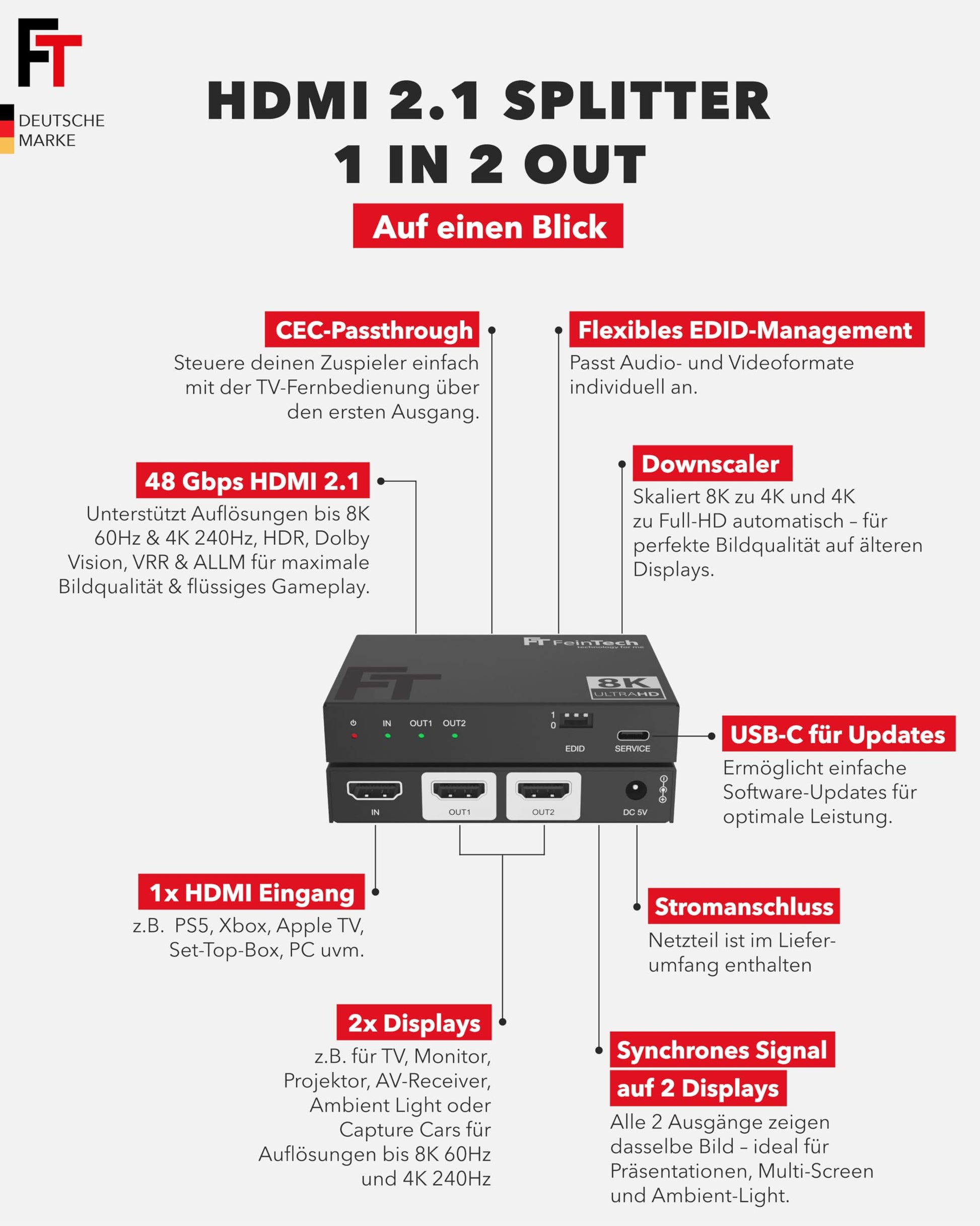 FeinTech SP210 HDMI 2.1 Splitter 4K 120Hz 8K für 2 Monitore