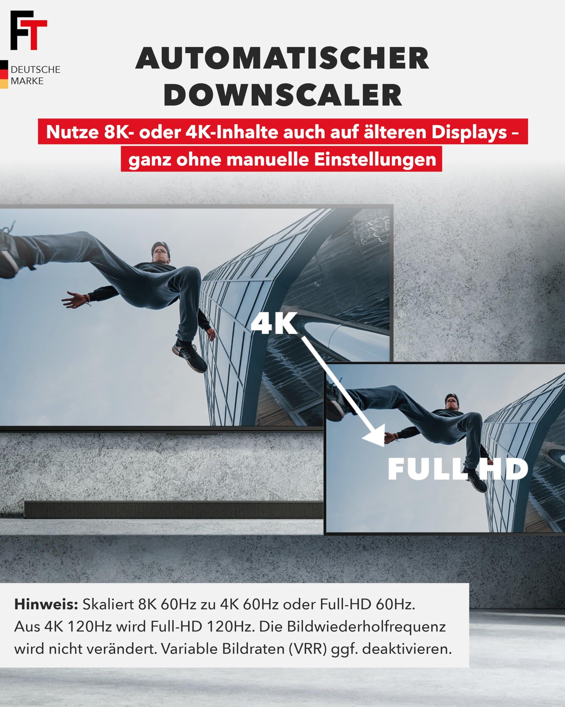 - Intelligenter Downscaler: Gewährleistet auf jedem angeschlossenen Display die bestmögliche Bildqualität. Der Verteiler skaliert 8K- oder 4K-Inhalte automatisch auf eine niedrigere Auflösung herunter, falls ein Bildschirm dies erfordert. (Hinweis: Es wird der Bildschirminhalt gespiegelt, eine Erweiterung des Desktops ist nicht möglich).