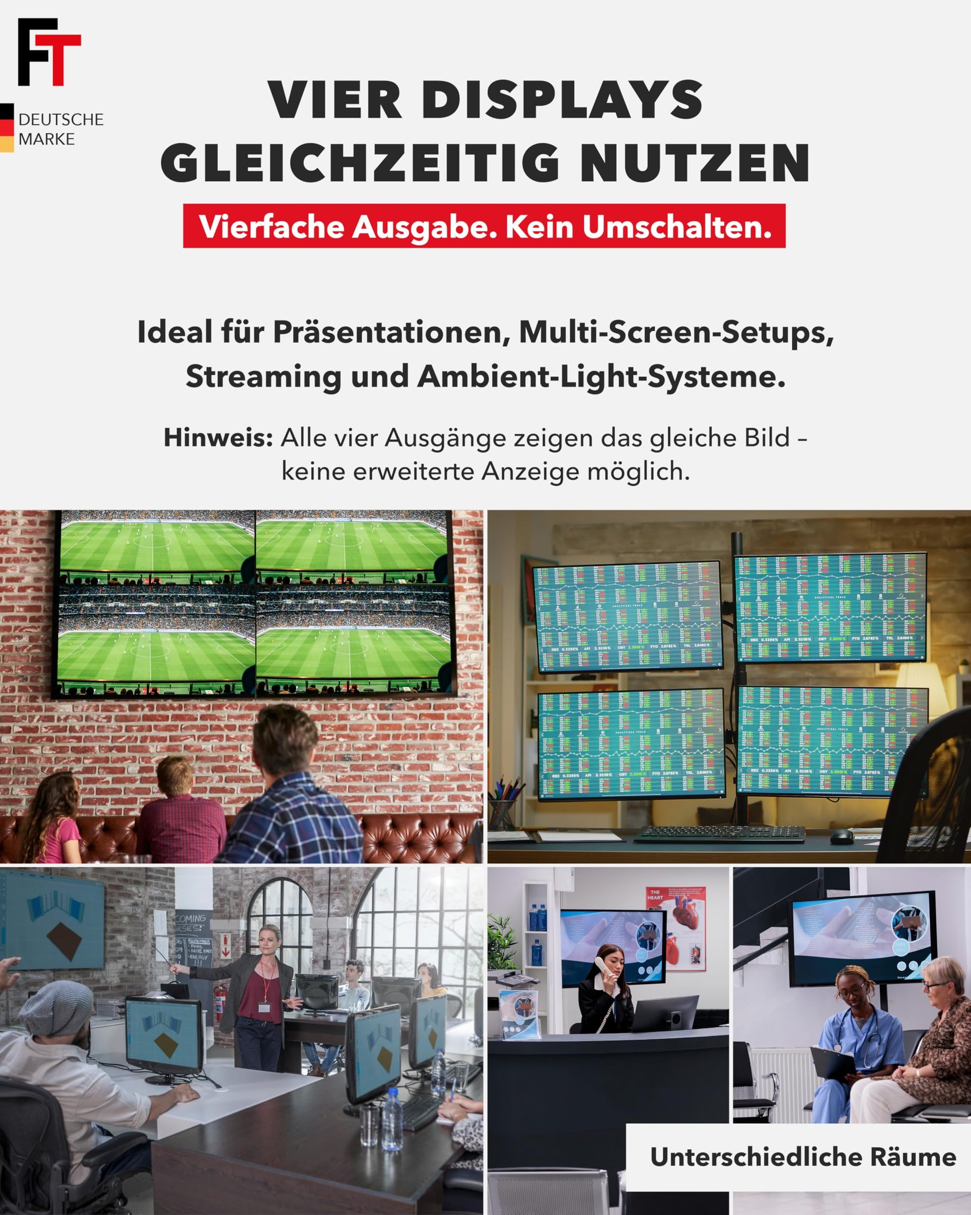 - 1 Quelle auf 4 Displays: Spiegelt das Signal Ihres Mediaplayers (z.B. Apple TV, Fire TV Stick), Computers oder Ihrer Spielkonsole (PS5, Xbox) simultan auf bis zu vier Ausgabegeräte wie Fernseher, Monitore, Beamer oder Capture Cards.