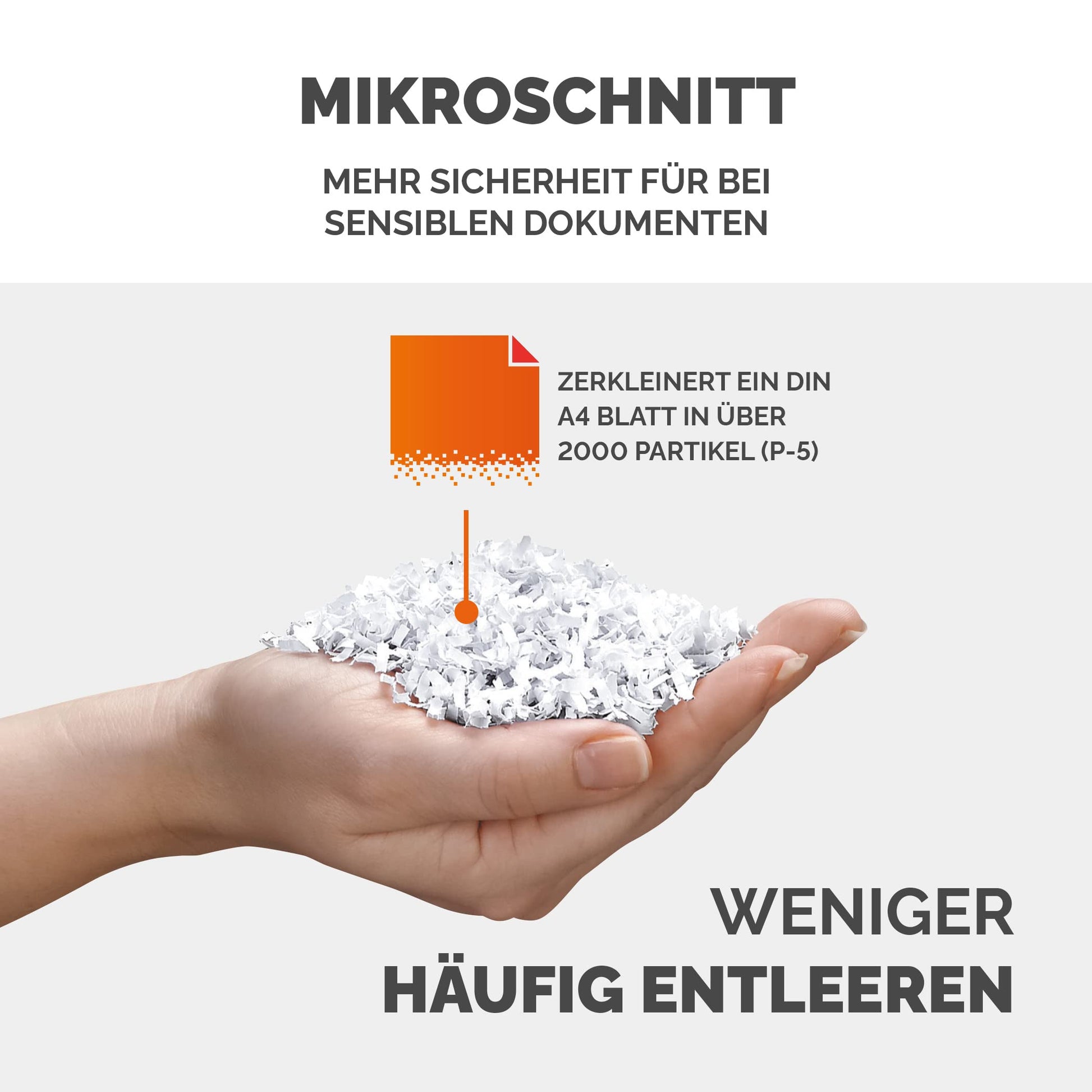 - Extrem feine Partikel: Jedes A4-Blatt wird in über 2000 winzige Partikel (2 x 12 mm) zerlegt.