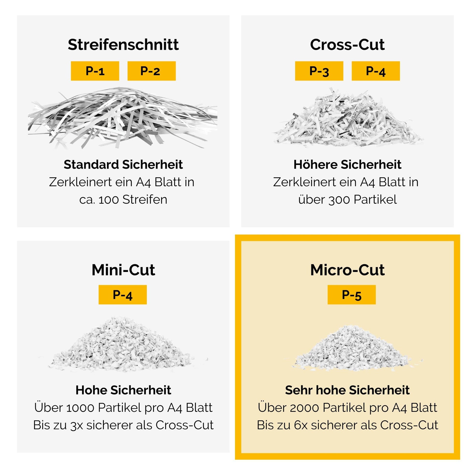 Die Sicherheitsstufe P-5 bietet höchsten Schutz für vertrauliche Daten. Der Aktenvernichter nutzt das Mikroschnitt-Verfahren, um ein A4-Blatt in über 2000 winzige Partikel (2 x 12 mm) zu zerlegen. Eine Wiederherstellung der Dokumente ist damit praktisch unmöglich, was ideal zum Schutz vor Identitätsdiebstahl ist.
