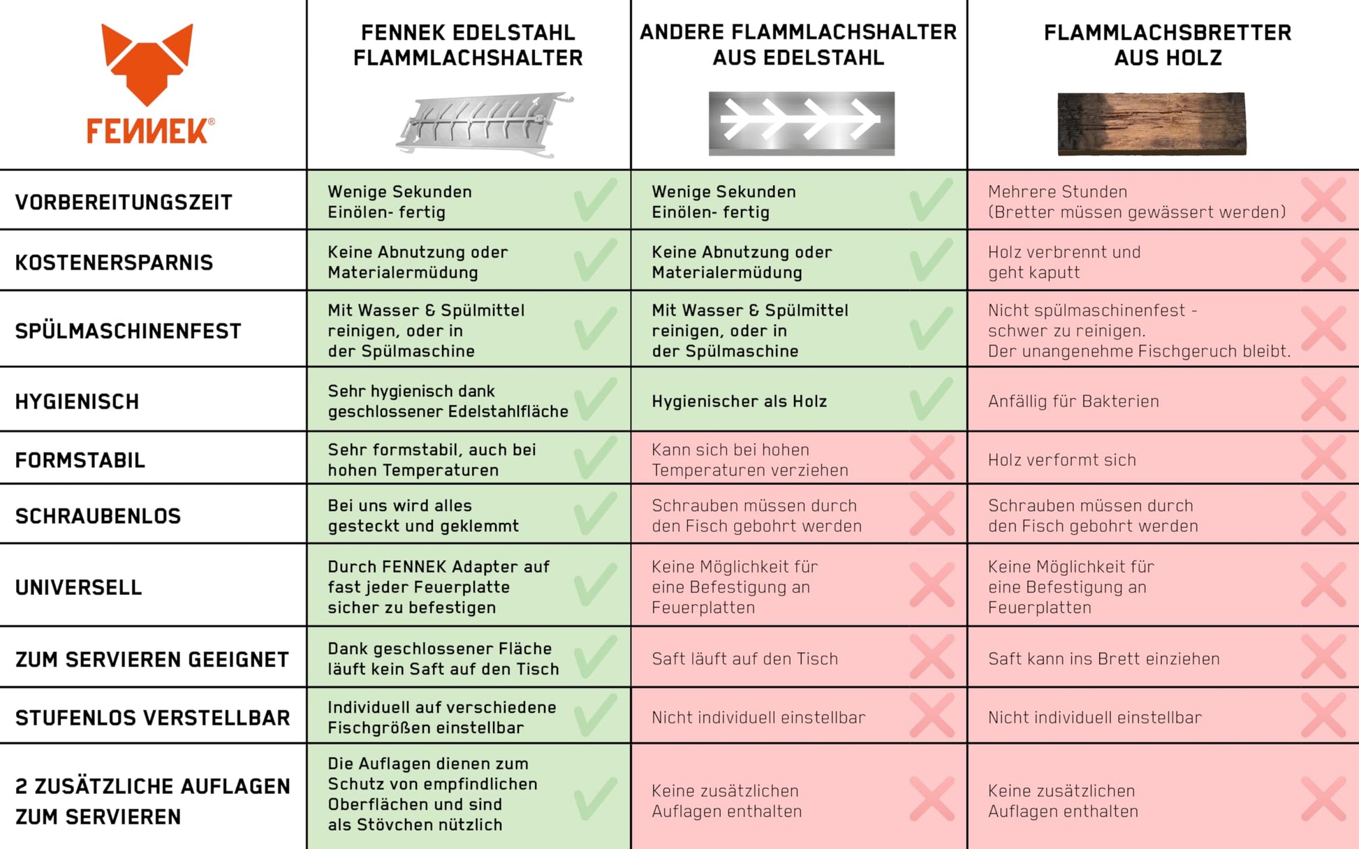 Im Gegensatz zu Holzbrettern ist der FENNEK Halter aus Edelstahl sofort einsatzbereit, ohne vorheriges Wässern. Er ist langlebiger, verzieht sich nicht durch Hitze, ist hygienischer (resistent gegen Bakterien, nimmt keine Gerüche an) und kann zur einfachen Reinigung komplett in die Spülmaschine.