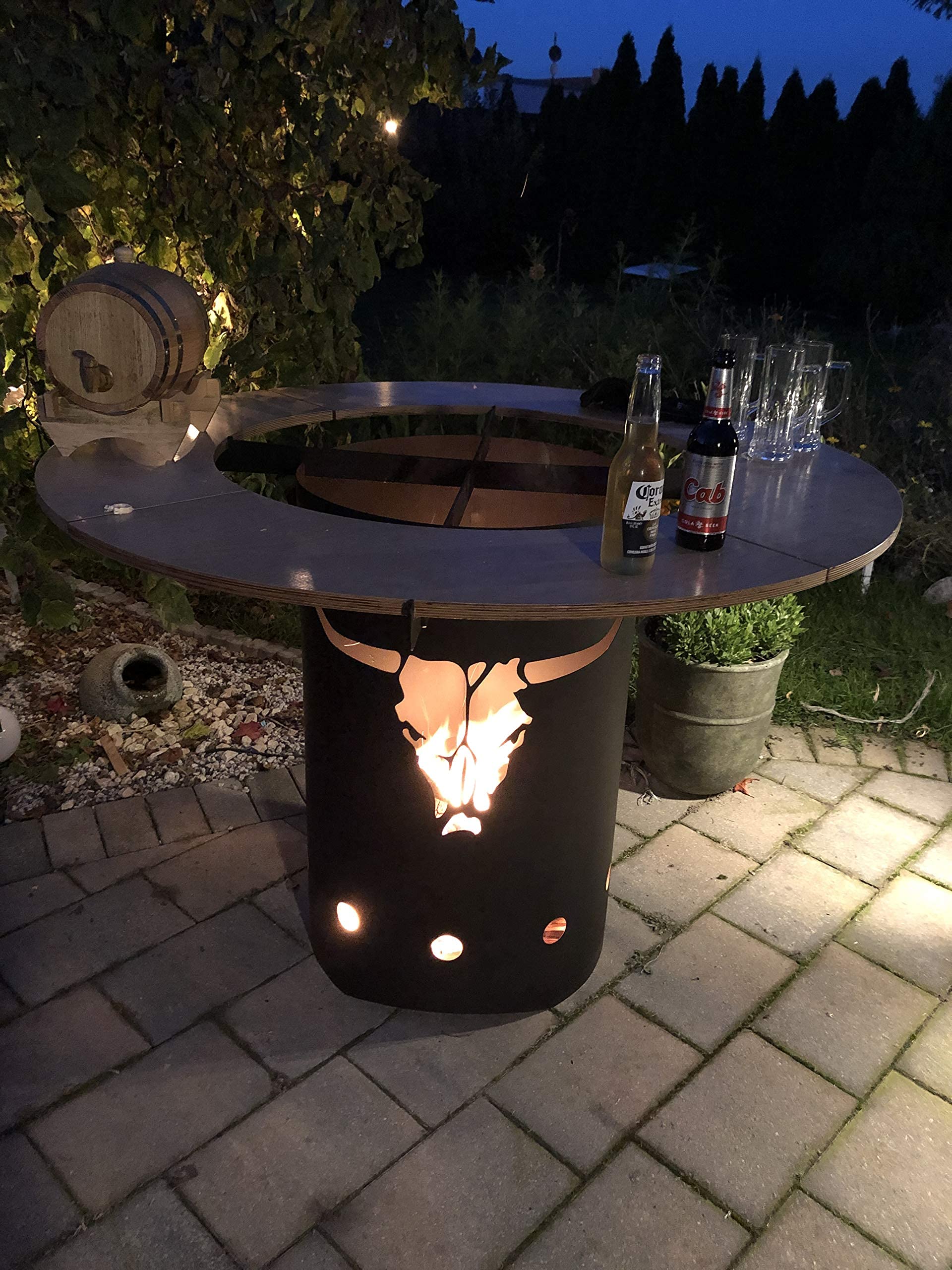 Ein Feuerkorb, der nicht im Lieferumfang enthalten ist, wird dringend empfohlen, um die Lebensdauer der Tonne zu maximieren. Er verhindert ein direktes Durchglühen der Aussenwand, schont das Material und positioniert das Feuer ideal, um das Stierkopf-Motiv effektvoll zu beleuchten.