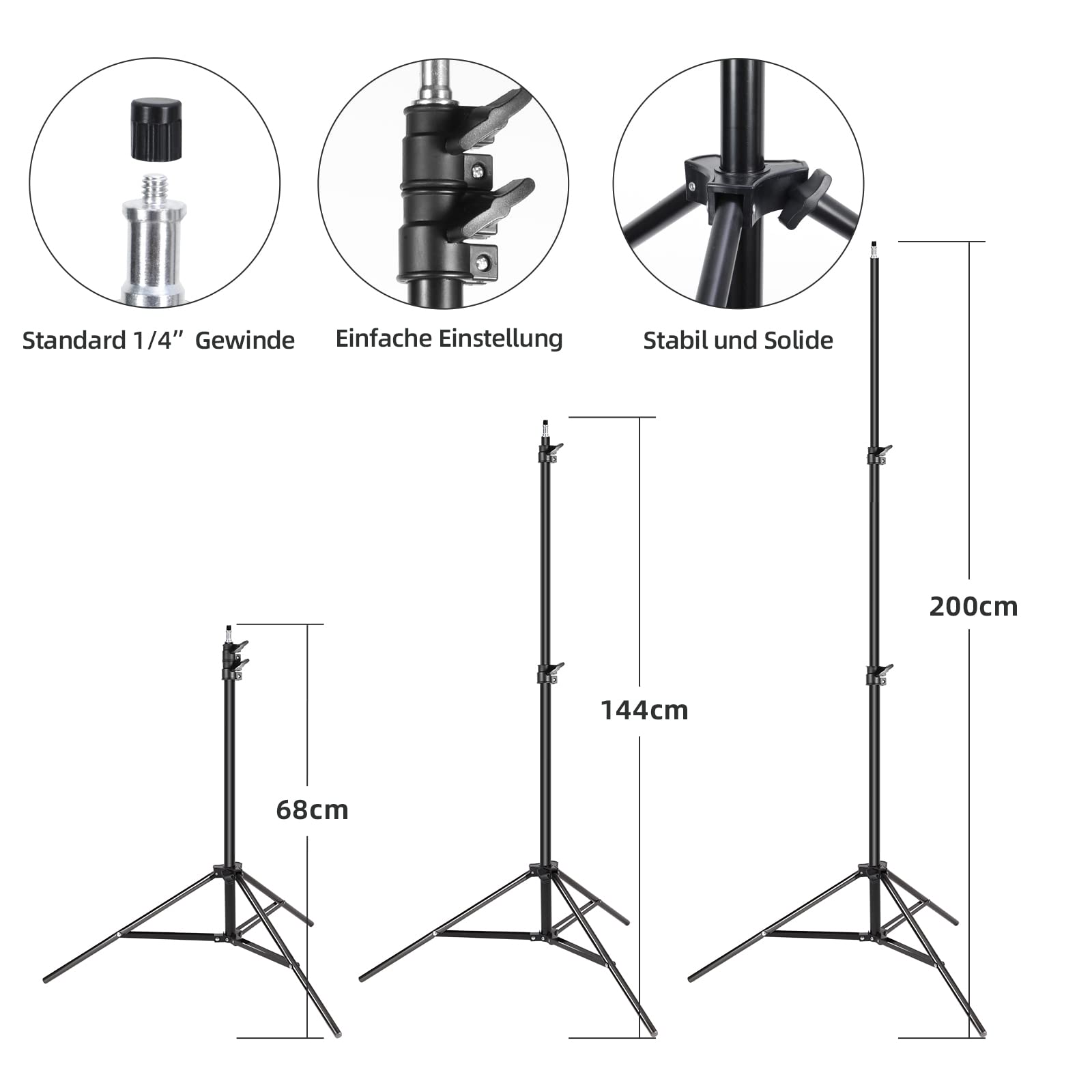 - Stabile und verstellbare Stative: Die aus einer hochwertigen Aluminiumlegierung gefertigten Lichtstative lassen sich von 68 cm auf bis zu 200 cm ausziehen und bieten einen sicheren Stand.