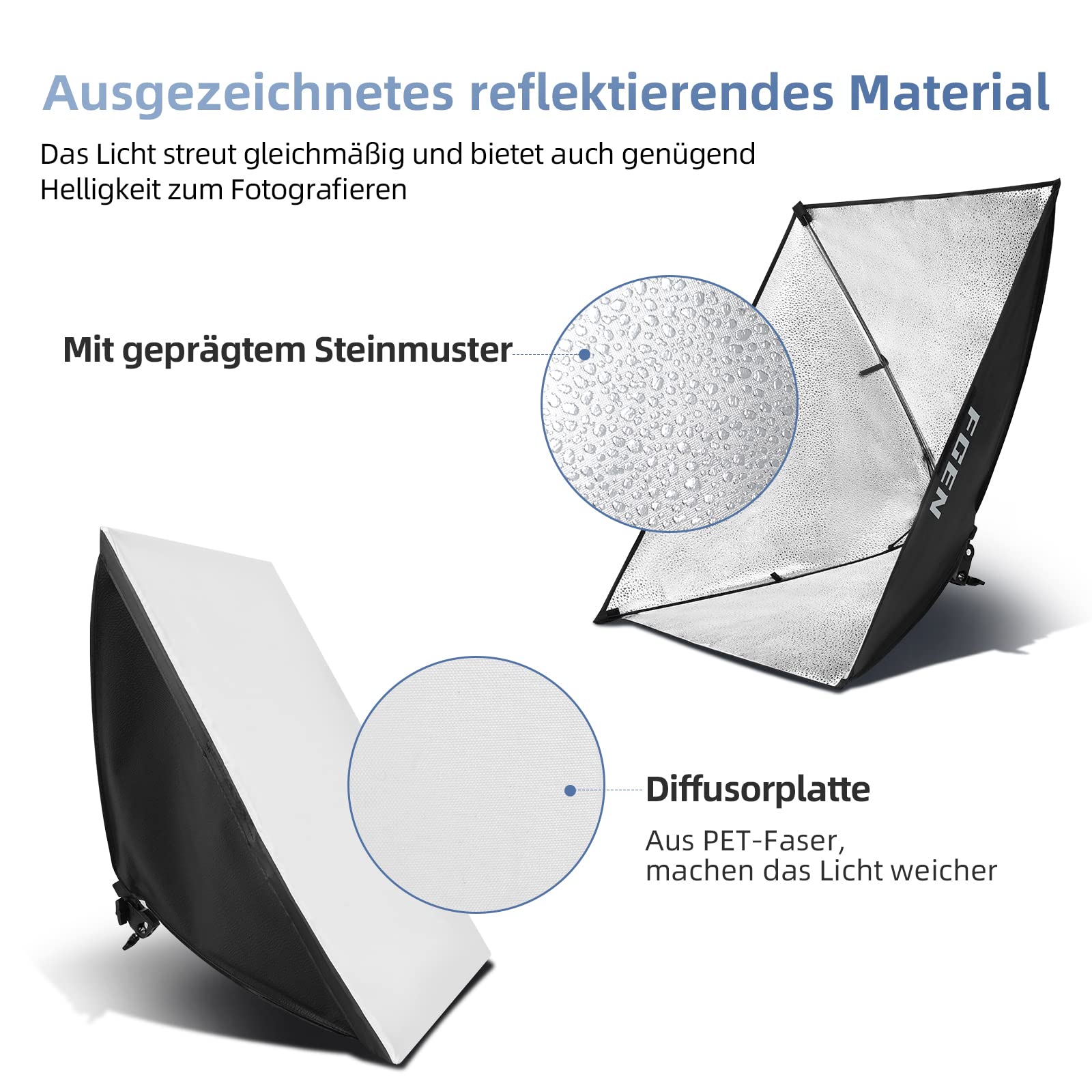 - Lieferumfang: 2x 50x70cm Softbox, 2x Lichtstativ (68-200cm), 2x 85W LED-Lampe, 2x Fernbedienung, 1x Bedienungsanleitung, 1x Tragetasche
