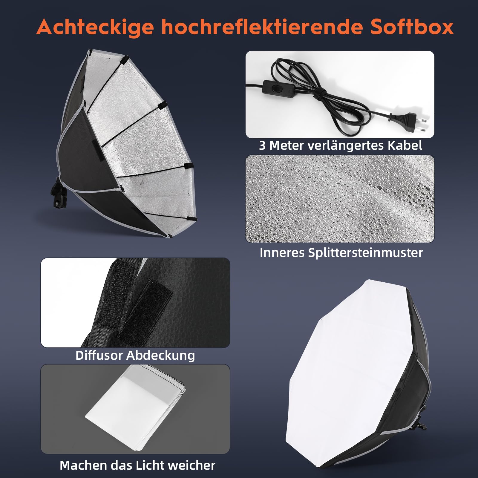 - Kompakte Softboxen: Zwei achteckige Softboxen mit einem Durchmesser von 50 cm für eine weiche, natürliche Lichtverteilung.
