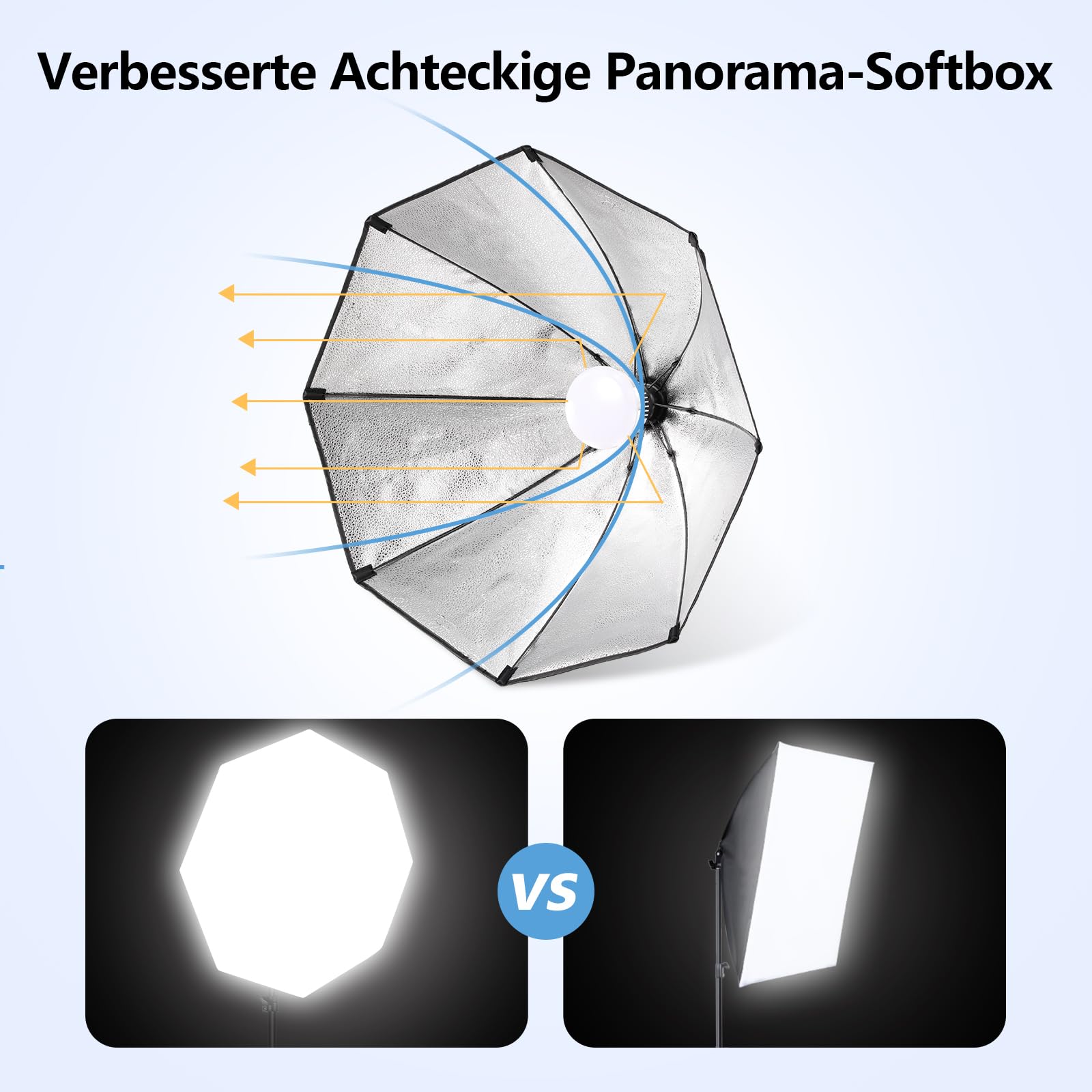 - Achteckige Softbox: Die 70 cm grosse, achteckige Softbox mit weissem Diffusor-Tuch erzeugt ein weiches, grossflächiges Licht und minimiert harte Schatten für ein professionelles Ergebnis.