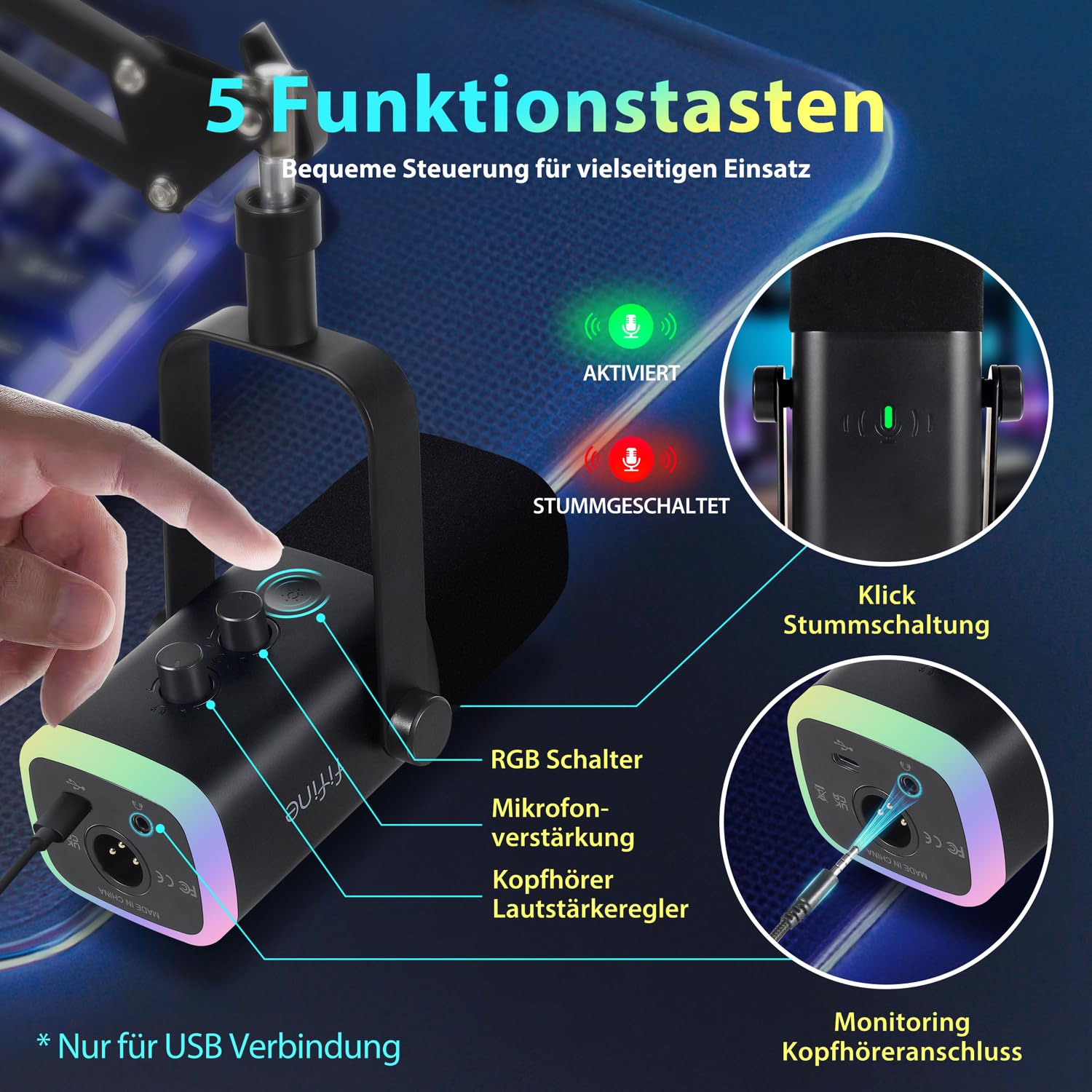 Dieses Mikrofon-Set ist die ideale All-in-One-Lösung für Content Creators. Die Kombination aus USB- und XLR-Anschluss bietet maximale Flexibilität, egal ob Sie gerade erst anfangen oder Ihr bestehendes Studio-Equipment erweitern möchten. Die direkten Kontrollmöglichkeiten wie die Stummschaltung und der Gain-Regler geben Ihnen jederzeit die volle Hoheit über Ihre Audioaufnahme, während Sie über den Kopfhörerausgang Ihre Stimme in Echtzeit überprüfen können.