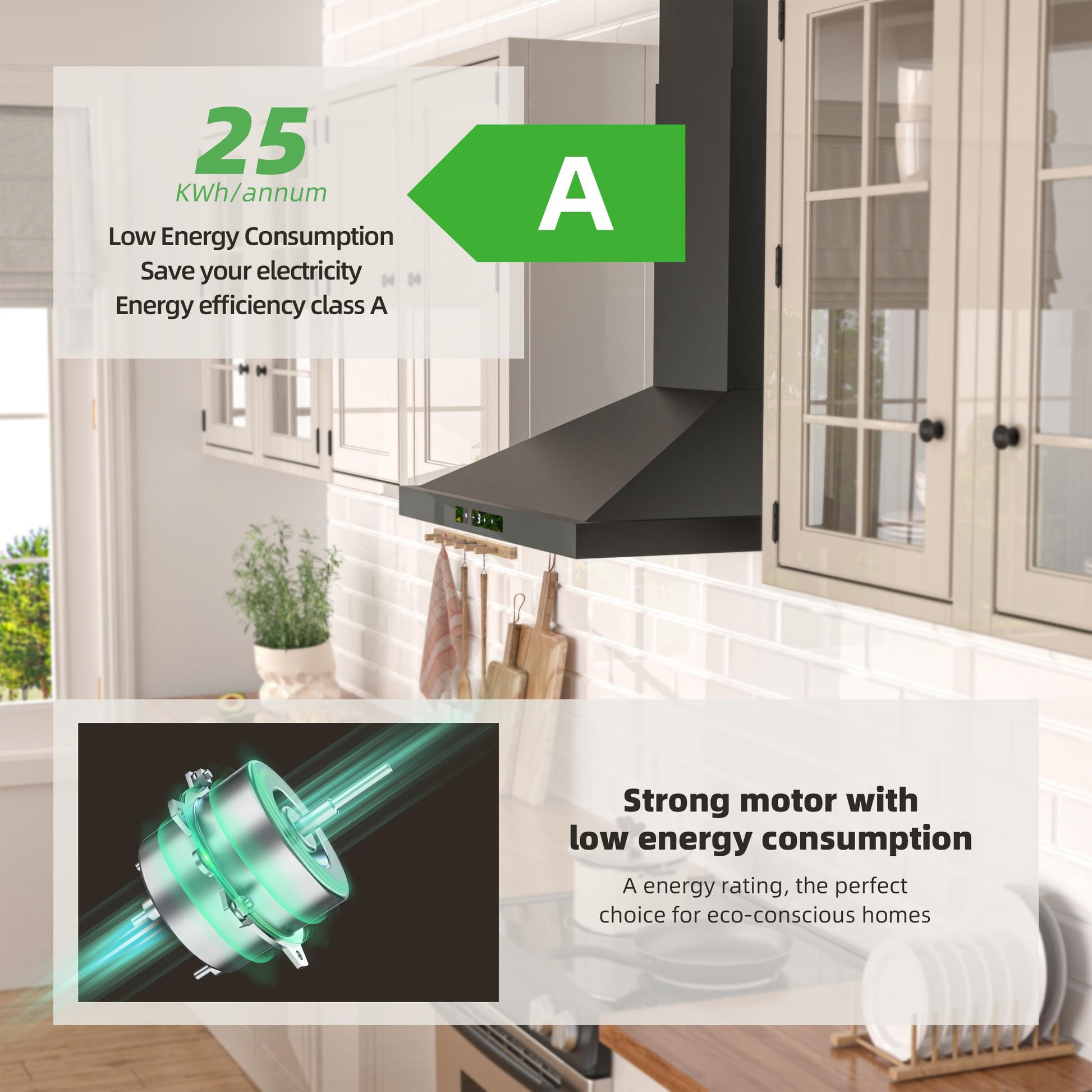 Die Haube ist mit der Energieeffizienzklasse A ausgezeichnet, was einen sehr sparsamen und umweltfreundlichen Betrieb sicherstellt. Dies führt zu einem geringen Jahresverbrauch und hilft Ihnen, bei den Stromkosten zu sparen, ohne bei der Leistung Kompromisse eingehen zu müssen.
