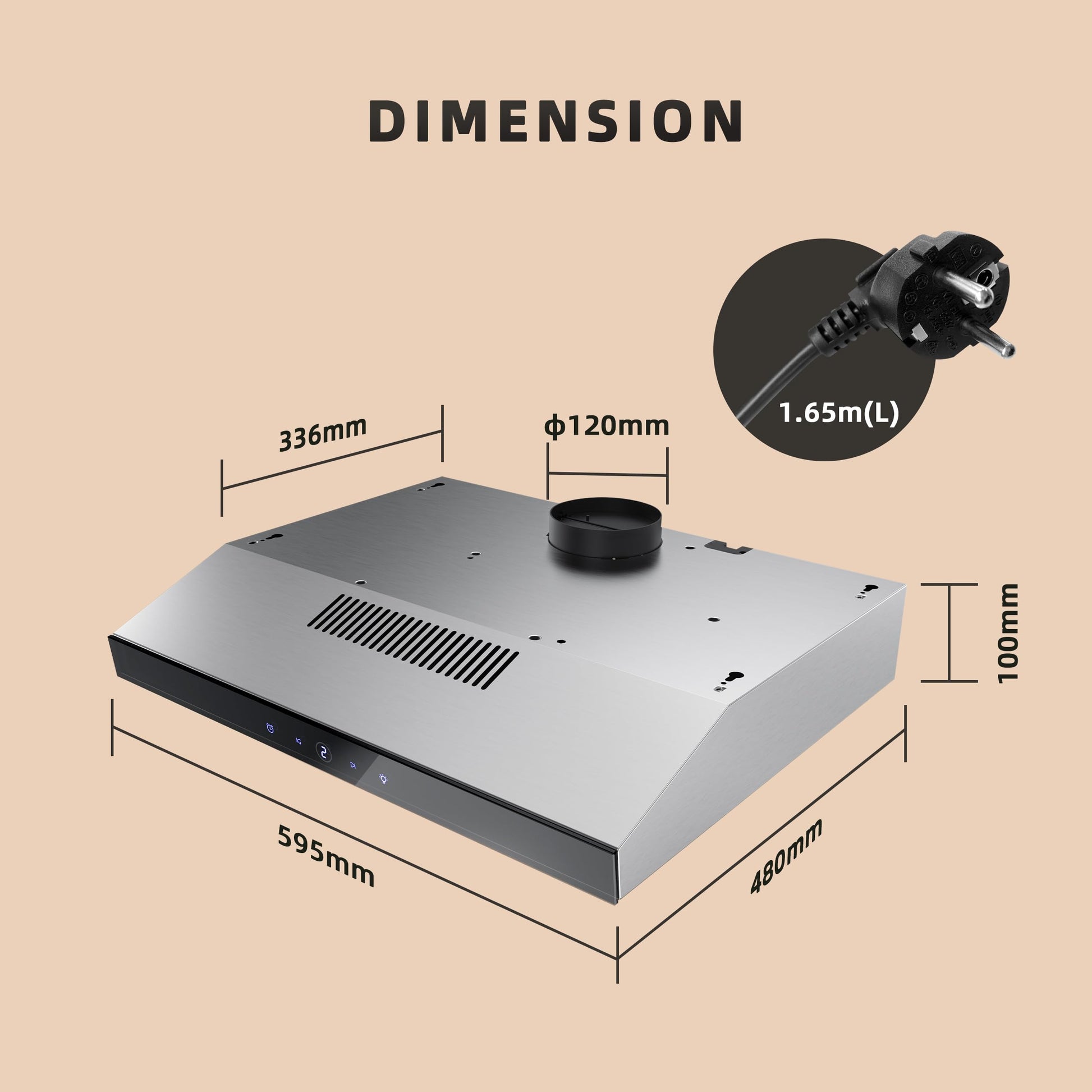 Diese Haube ist mit ihren kompakten Maßen von 595 x 485 x 100 mm die perfekte Lösung für kleinere Küchen oder solche mit begrenztem Platz. Sie kann flexibel und platzsparend unter einem Hängeschrank oder direkt an der Wand montiert werden.