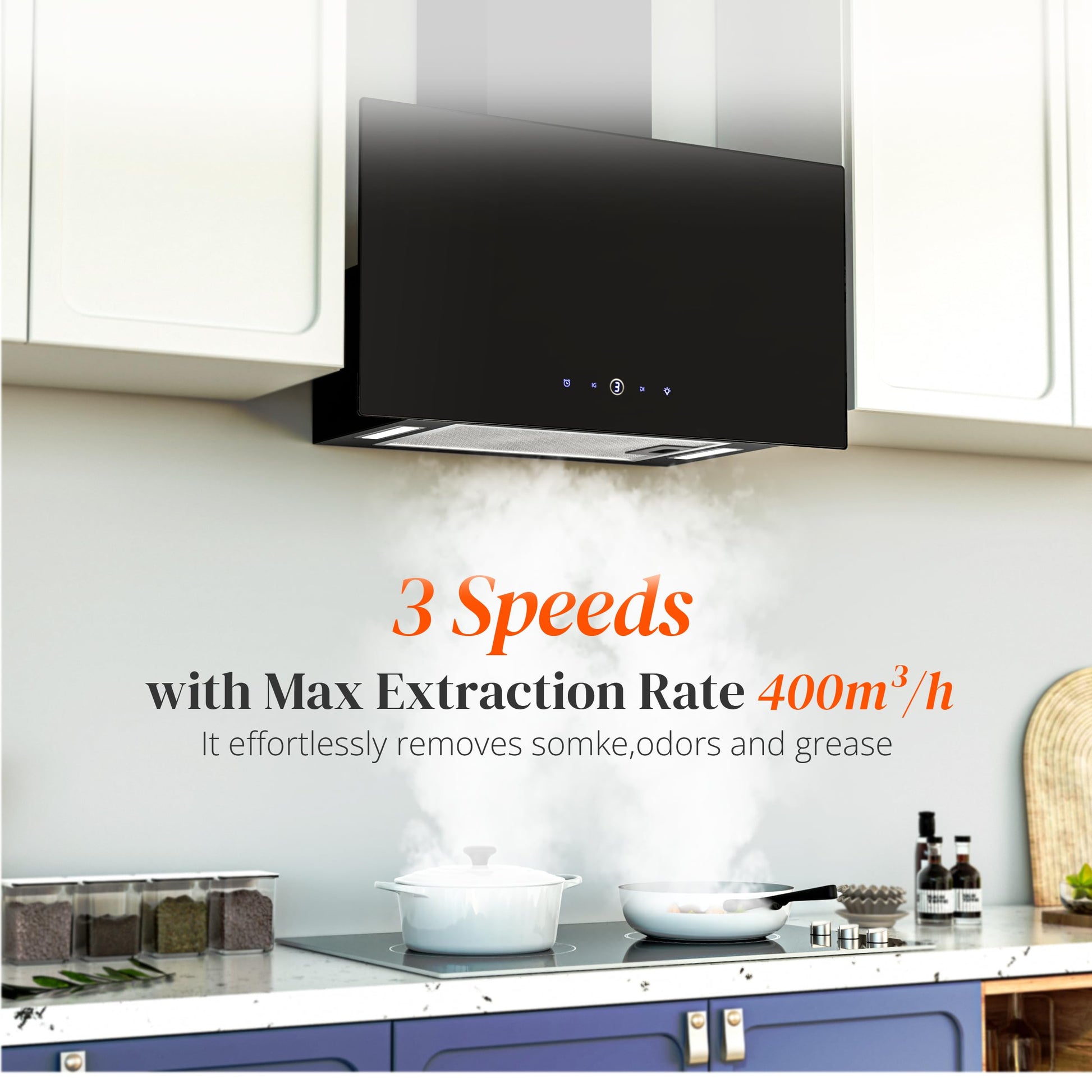 Dank des modernen, bürstenlosen DC-Motors ist die Haube mit nur 47 dB(A) außergewöhnlich leise. Gleichzeitig bietet sie eine starke Absaugleistung von 400 m³/h, um Kochdünste effektiv aus Ihrer Küche zu entfernen.