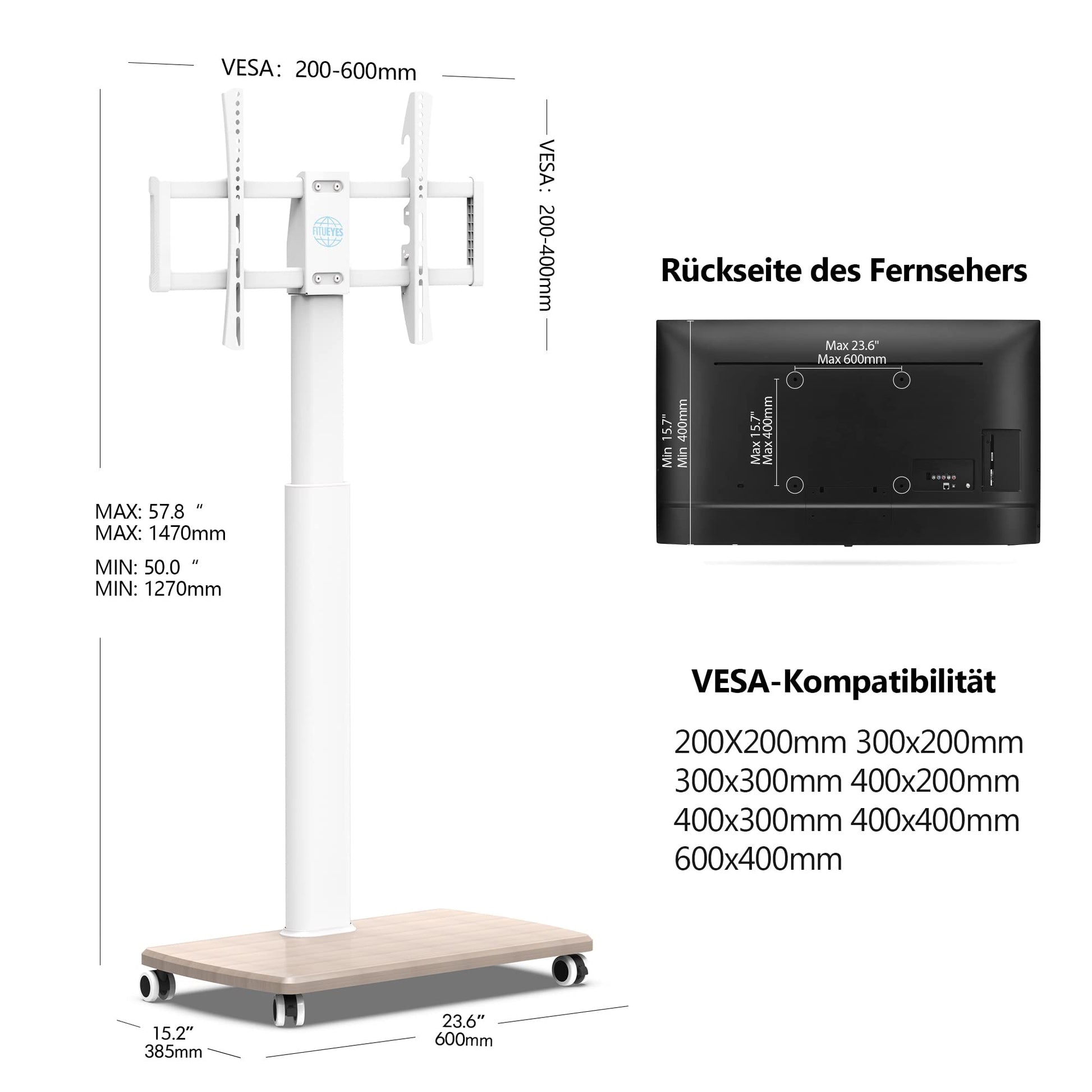 Dieser TV-Ständer ist universell für die meisten Fernseher und Monitore von 32 bis 70 Zoll geeignet. Entscheidend ist, dass Ihr Gerät nicht mehr als 40 kg wiegt und eine VESA-Norm zwischen 200x200 mm und 400x600 mm hat. Diese Angaben finden Sie meist auf der Rückseite Ihres Fernsehers oder im Handbuch.
