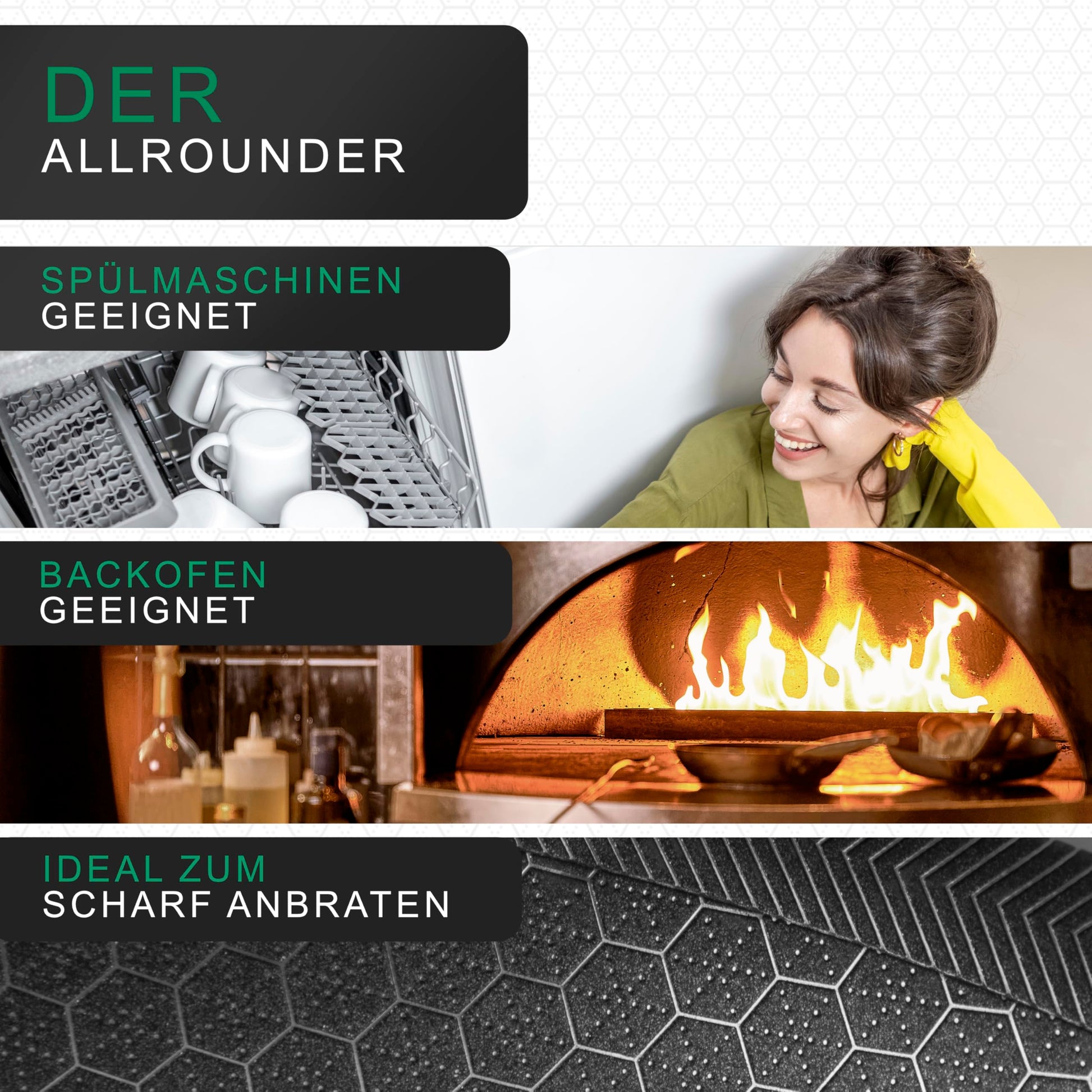 - Einzigartige Wabenstruktur: Ein speziell entwickeltes und geschütztes Wabendesign sorgt für eine optimale Hitzeverteilung und erstklassige Bratergebnisse.