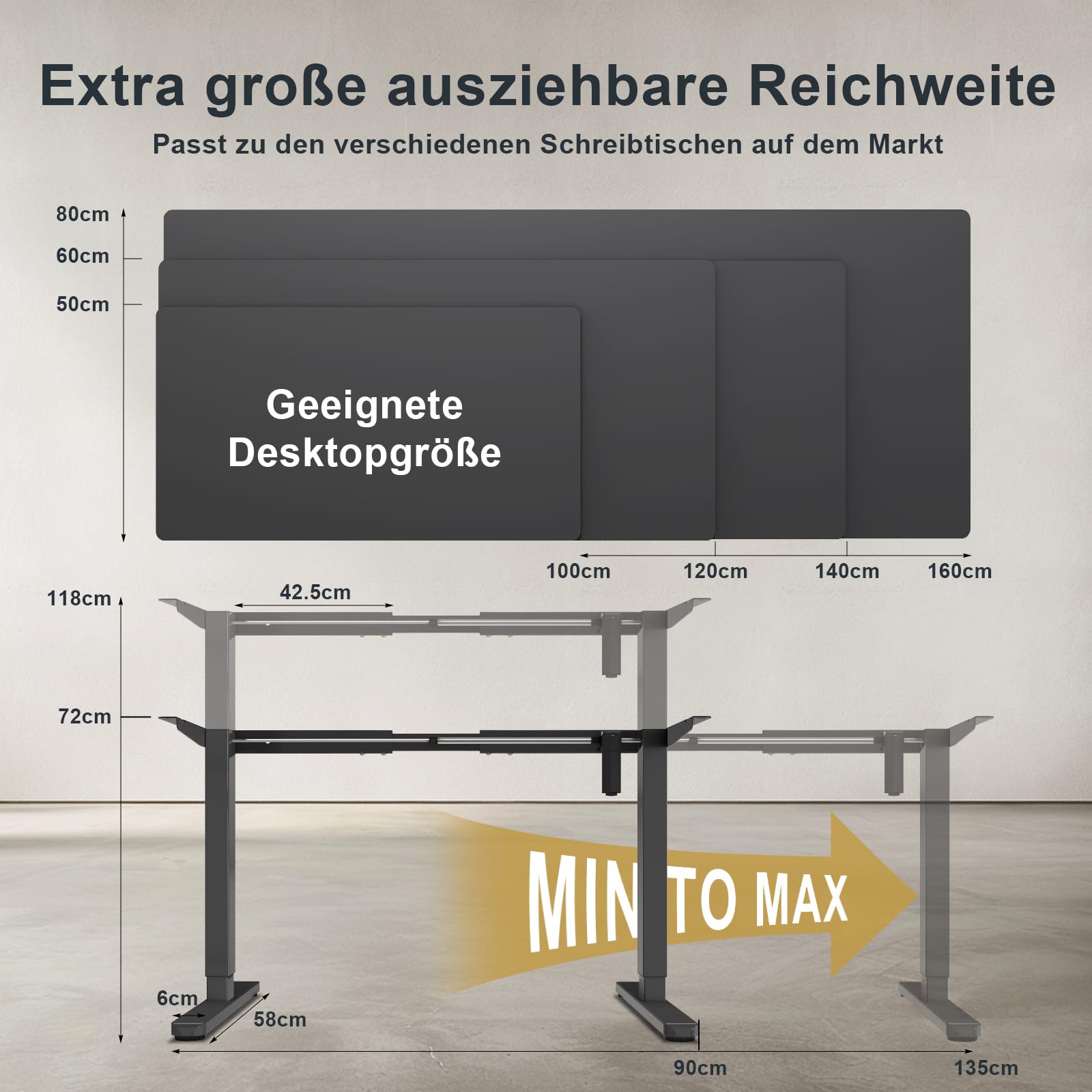 Dank seiner verstellbaren Breite ist das Gestell flexibel für Tischplatten mit einer Breite von 100 cm bis 160 cm und einer Tiefe von 50 cm bis 80 cm konzipiert, um optimale Stabilität zu gewährleisten.