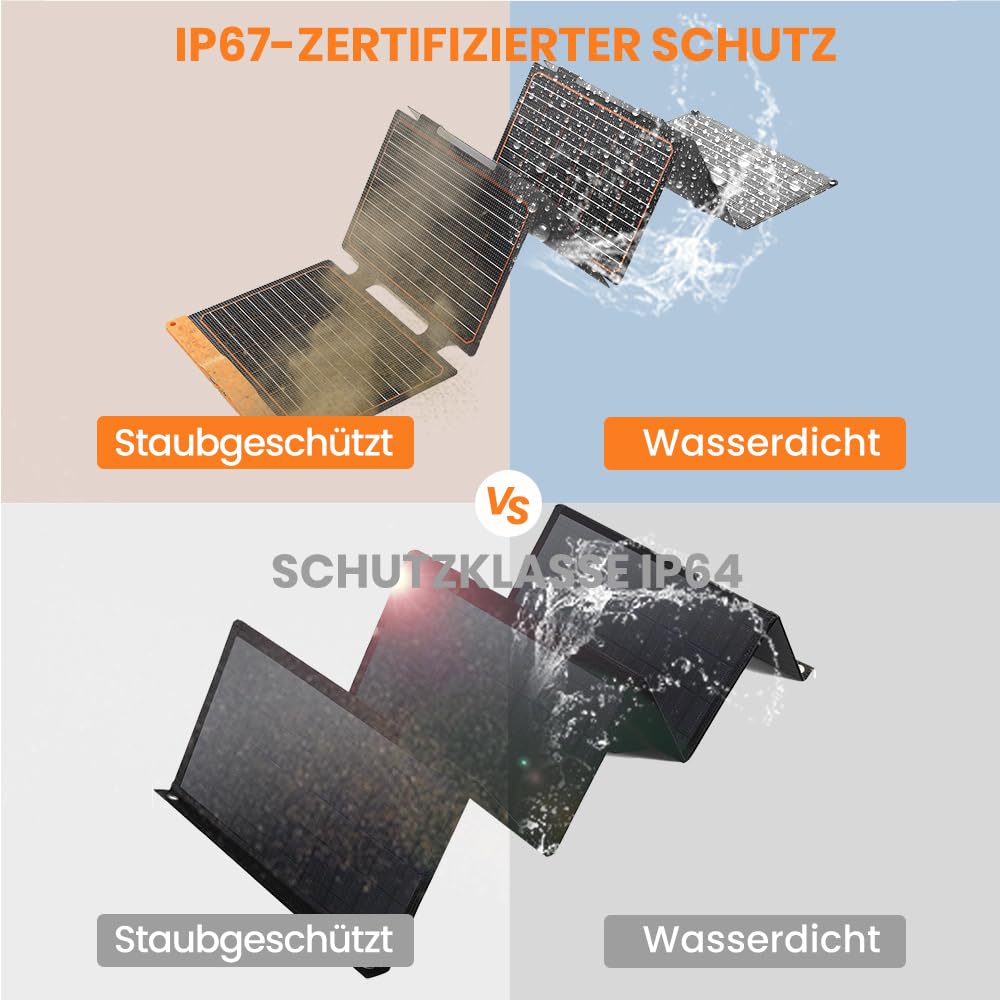 Das Panel selbst ist nach IP67 staub- und wasserdicht und hält somit auch Regen stand. Wichtig: Die Anschlussbox mit den USB- und DC-Ports ist nicht wasserdicht und muss unbedingt trocken gehalten werden, um Schäden zu vermeiden.