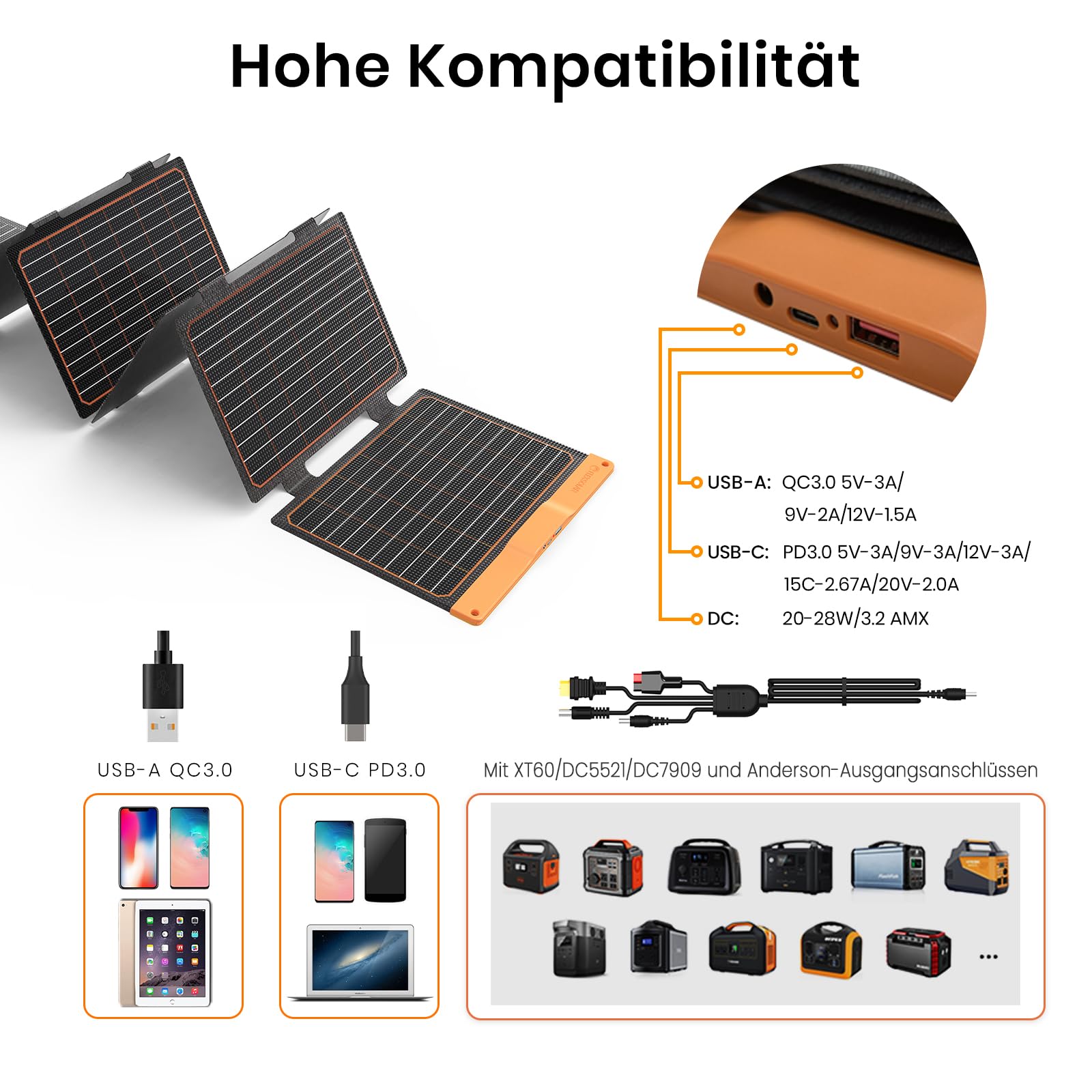 - Intelligente Ladetechnologie: Ein integrierter Chip erkennt angeschlossene Geräte automatisch und optimiert den Ladestrom für maximale Geschwindigkeit und Sicherheit. Eine LED-Leuchte zeigt an, wann das Panel ladebereit ist.