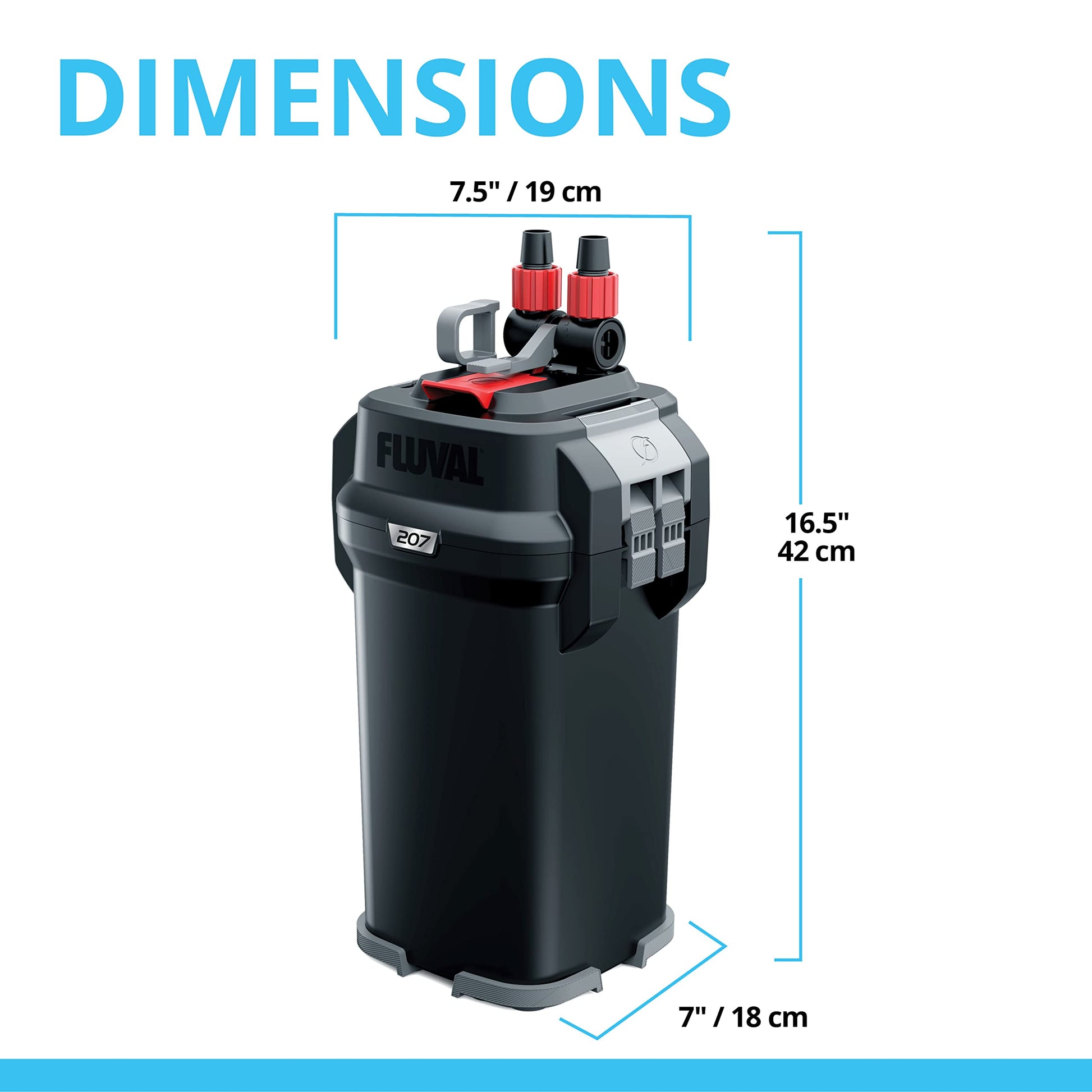 Der Fluval 207 ist ideal für Aquarien mit einem Volumen von 60 bis 220 Litern konzipiert. Mit einer Pumpenleistung von 780 Litern pro Stunde gewährleistet er eine effiziente und zuverlässige Filterung für diese Beckengrösse.
