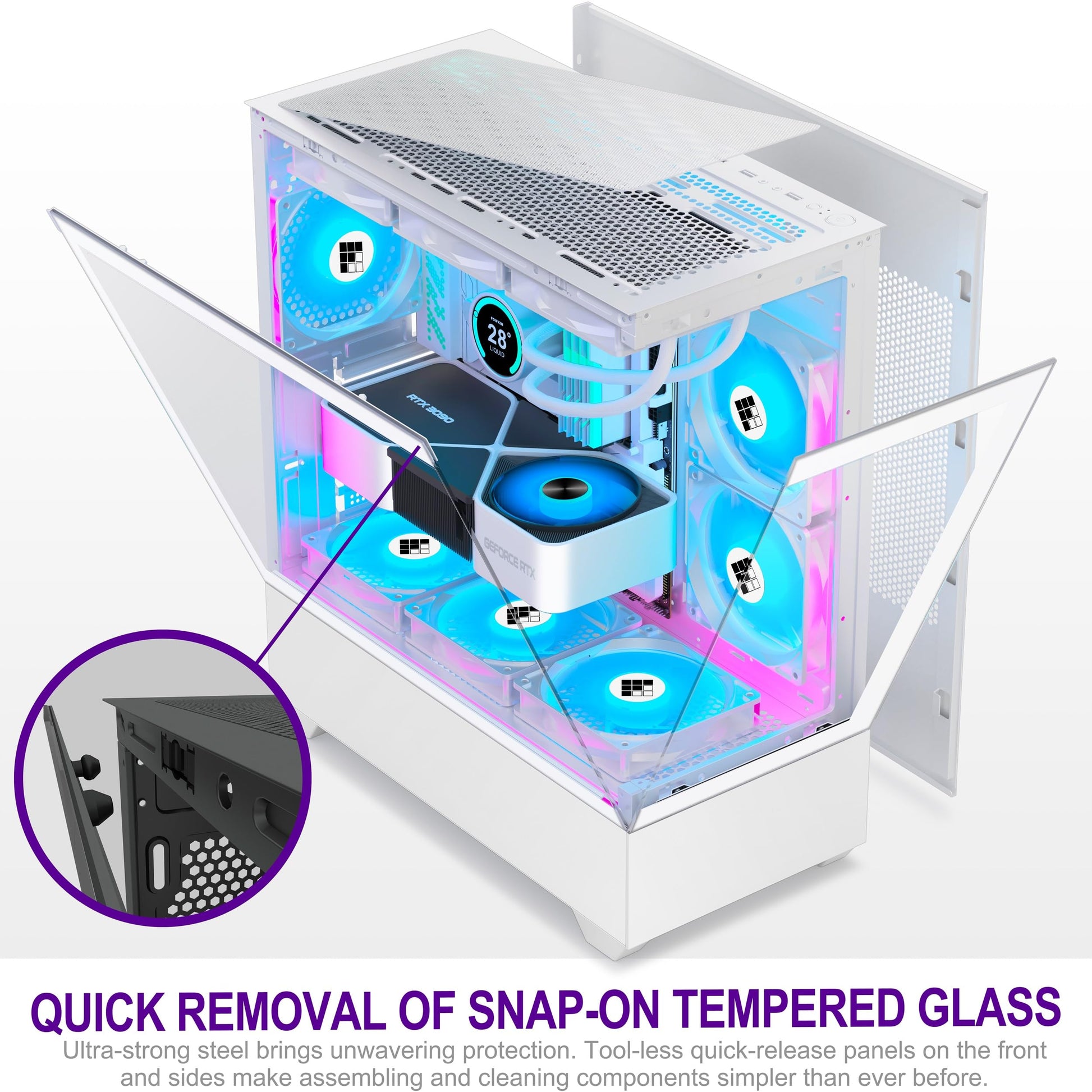 - 270° Panoramadesign: Zwei grosse Seitenteile aus gehärtetem Glas gewähren einen fast nahtlosen Einblick in das Innere Ihres PCs und setzen Ihre Hardware gekonnt in Szene.